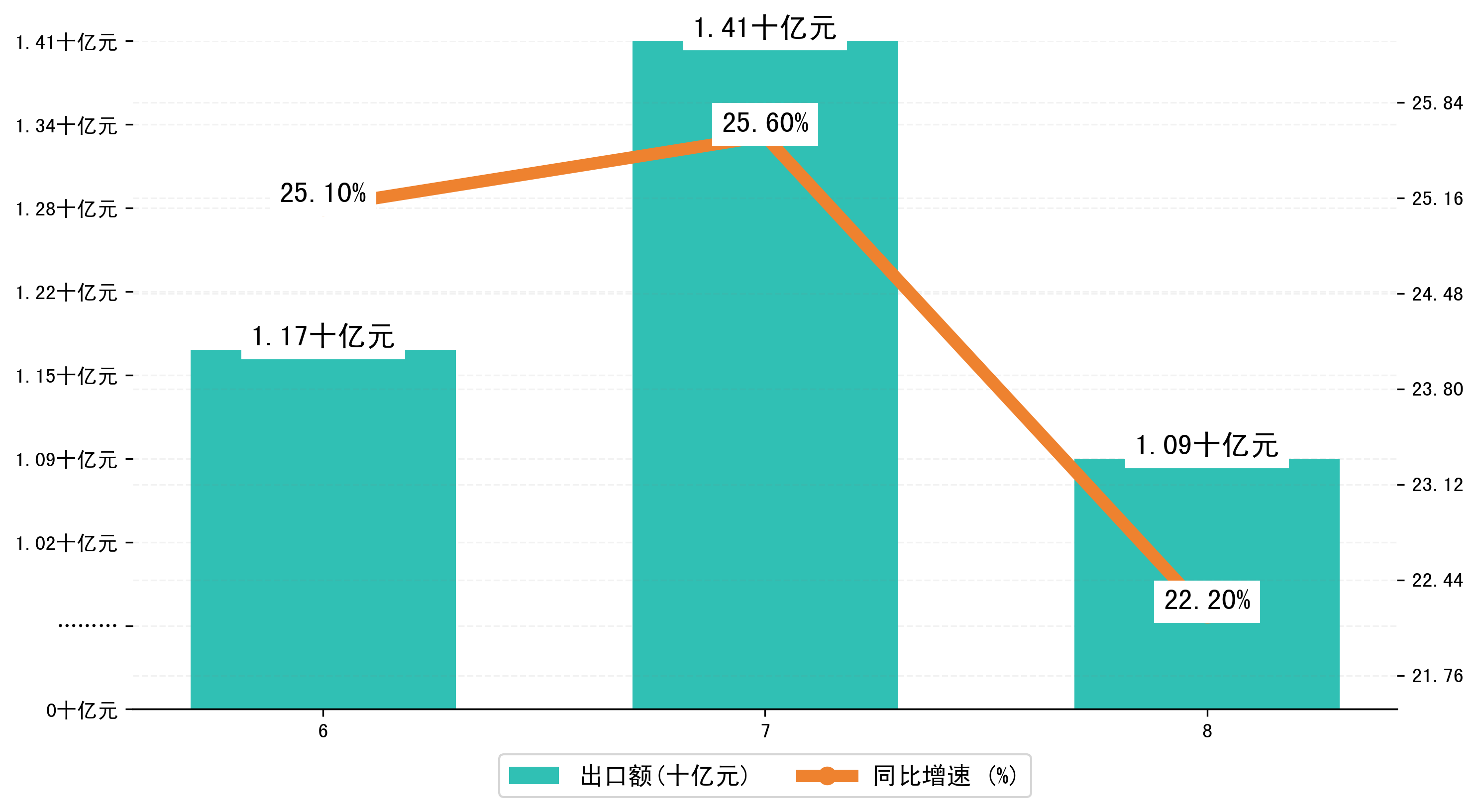 以人民币计,2025年1-8月呼和浩特市出口额为96,9209.0425万元,相比上年同期增加了17,7738.3304万元,同比增加了22.20%。