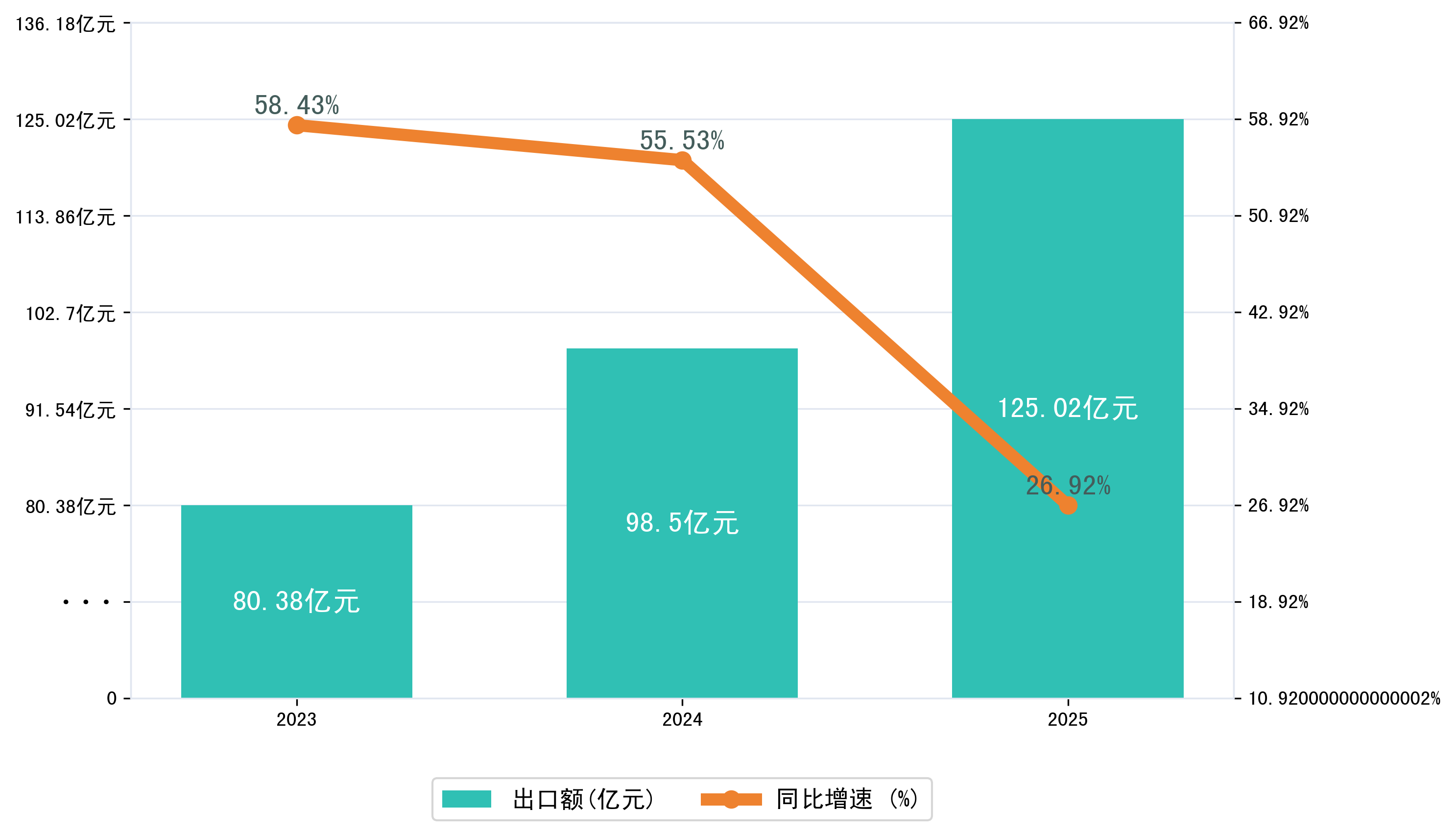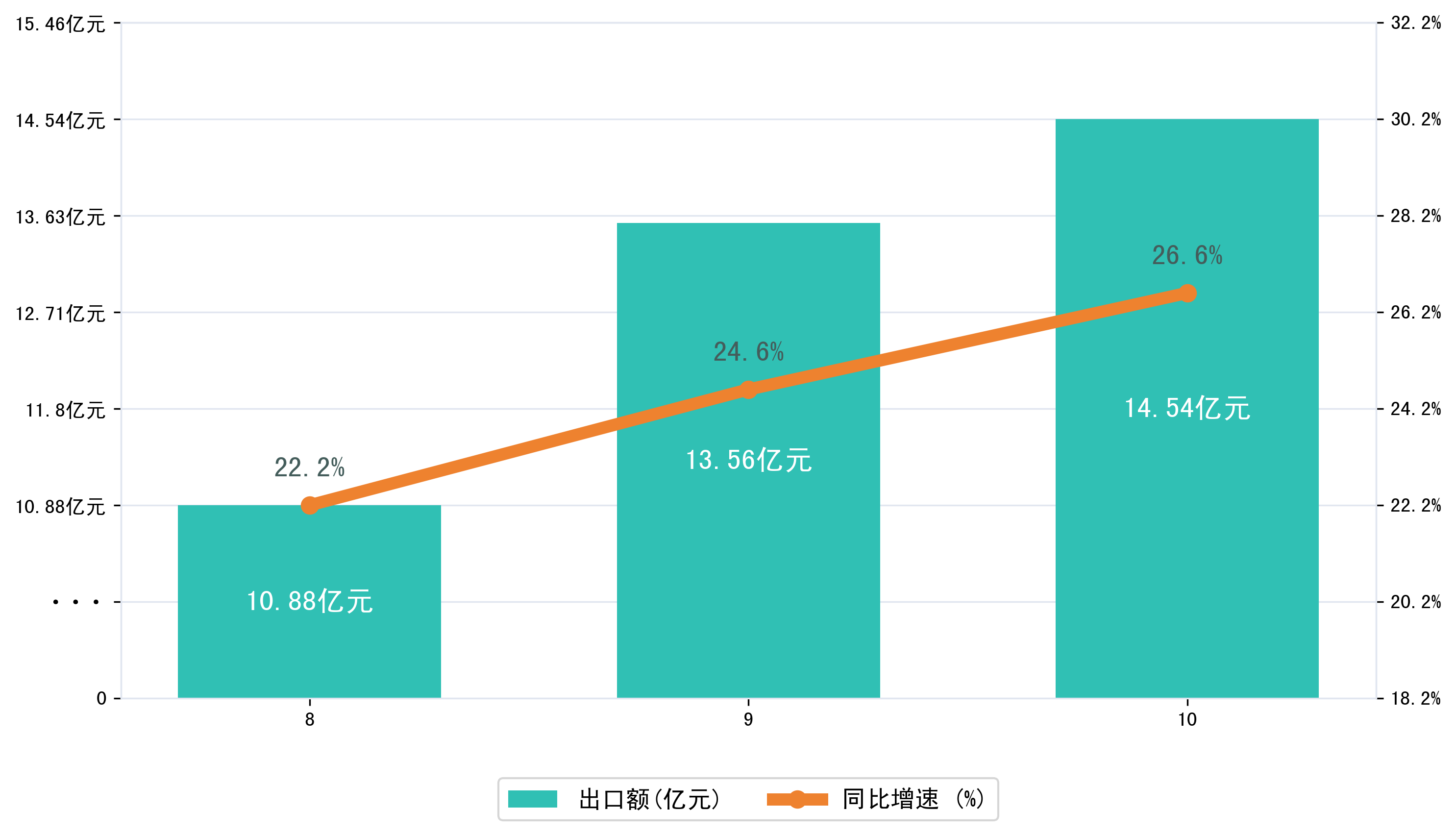 以人民币计,2025年10月呼和浩特市出口额为14,5407.5636万元,相比上月增加了9837.4345万元;相比上年同期增加了4,6132.8873万元,同比增加了26.60%。