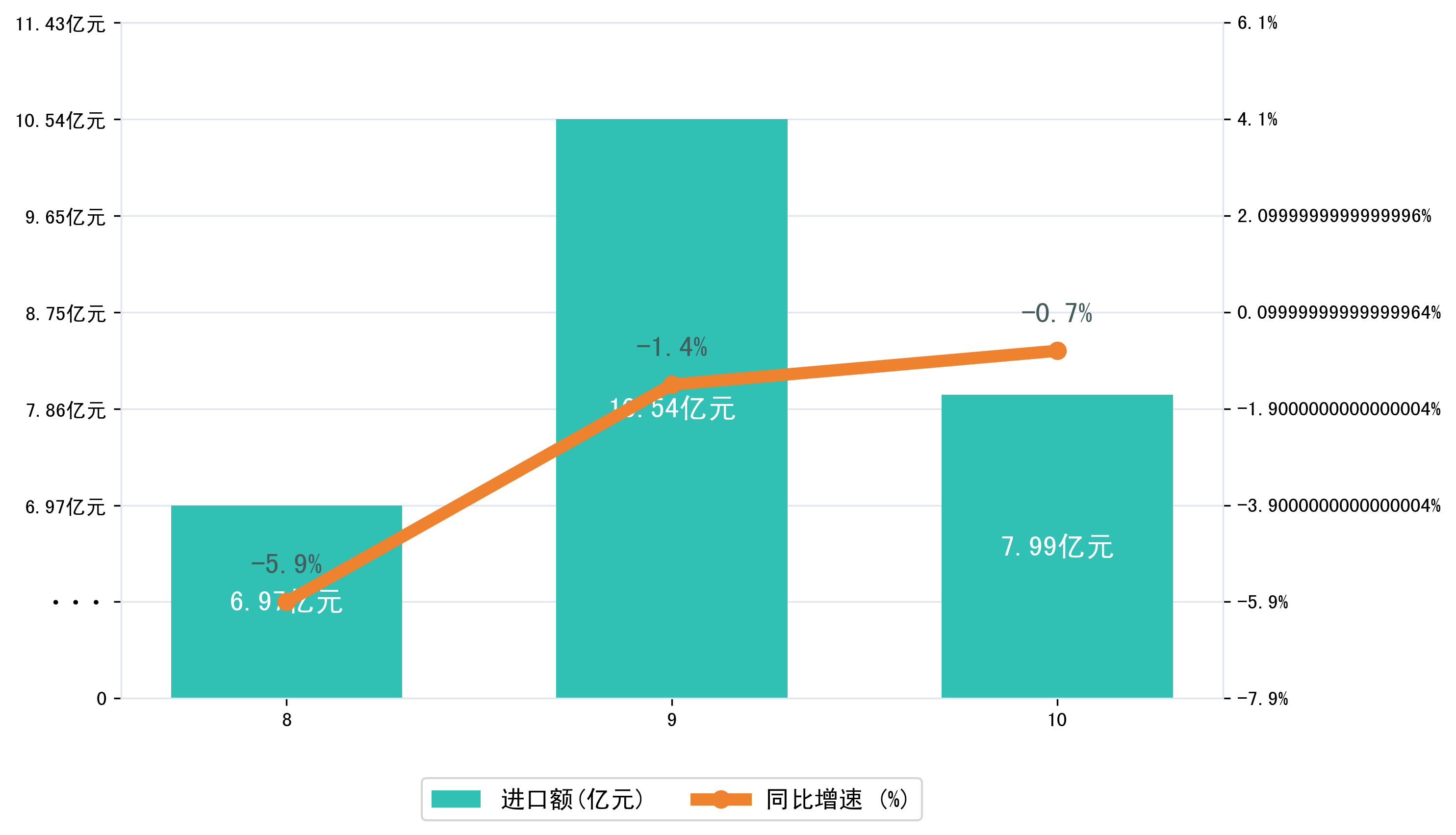 以美元计,2025年10月呼和浩特市进口额为1,1206.3149万美元,相比上月减少了3577.4527万美元;相比上年同期增加了551.1032万美元,同比减少-1.70%。