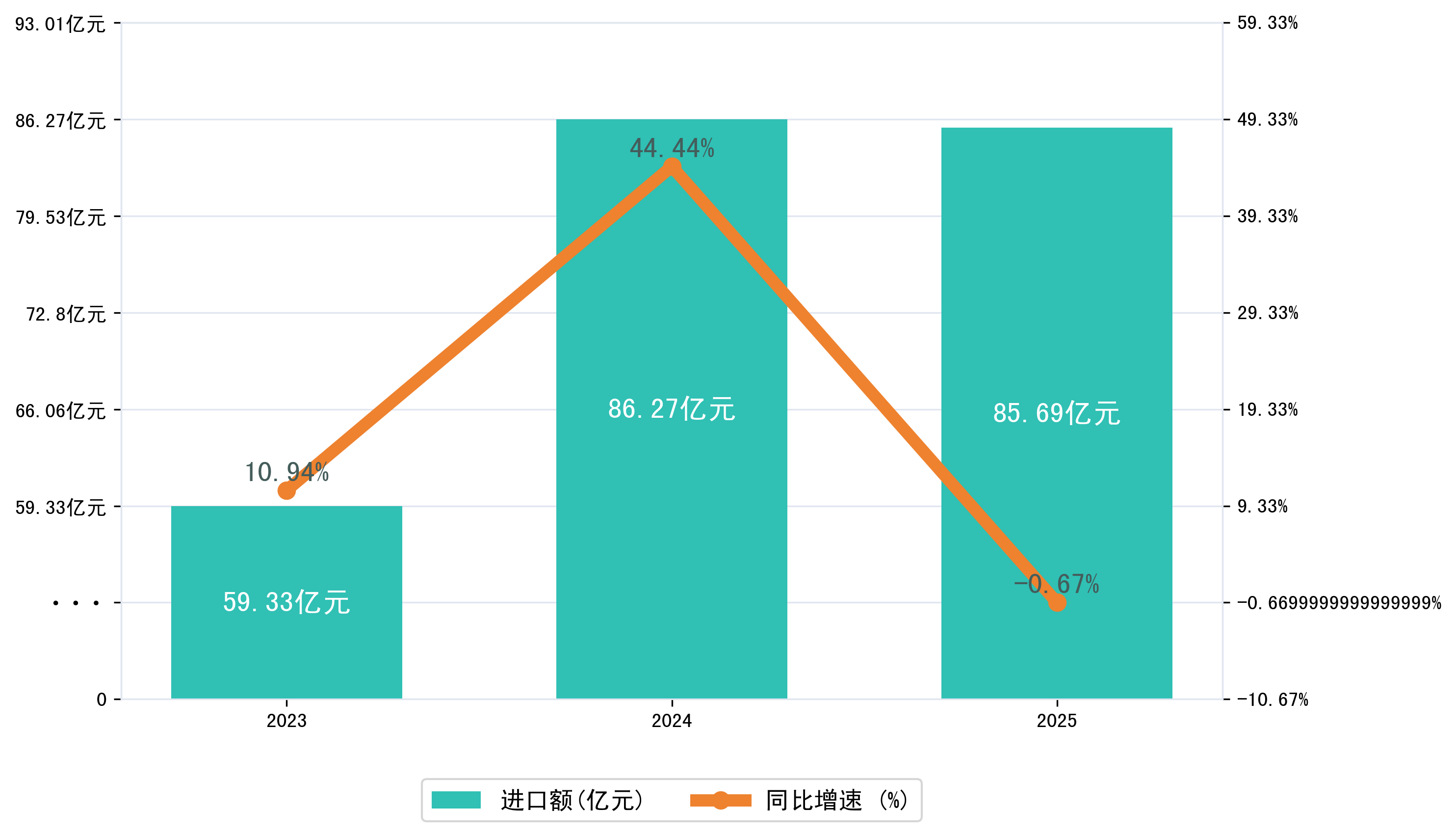 以人民币计,2025年1-10月呼和浩特市进口额为85,6906.2274万元,相比上年同期减少了5805.5749万元,同比减少了-0.70%。