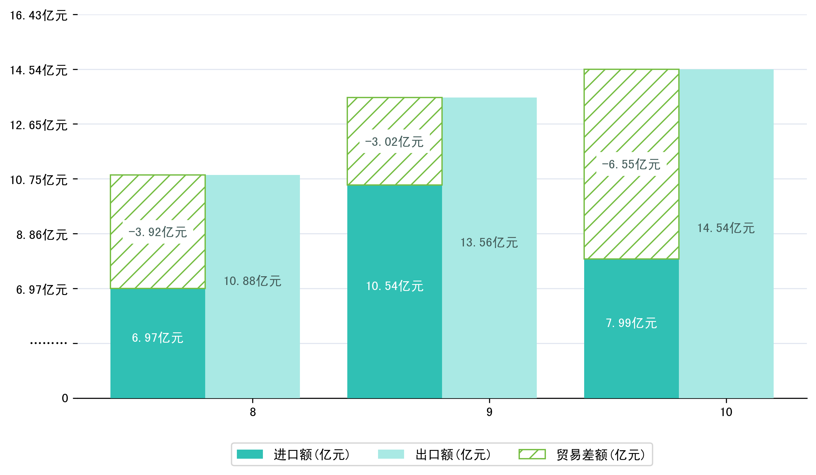 以人民币计,2025年10月呼和浩特市贸易差额为6,5535,0260万元(贸易顺差),相比上月增加了3,5356,5721万元,即5026,4783万美元;相比上年同期增加了4,1642,5211万元,同比增加174.29%。