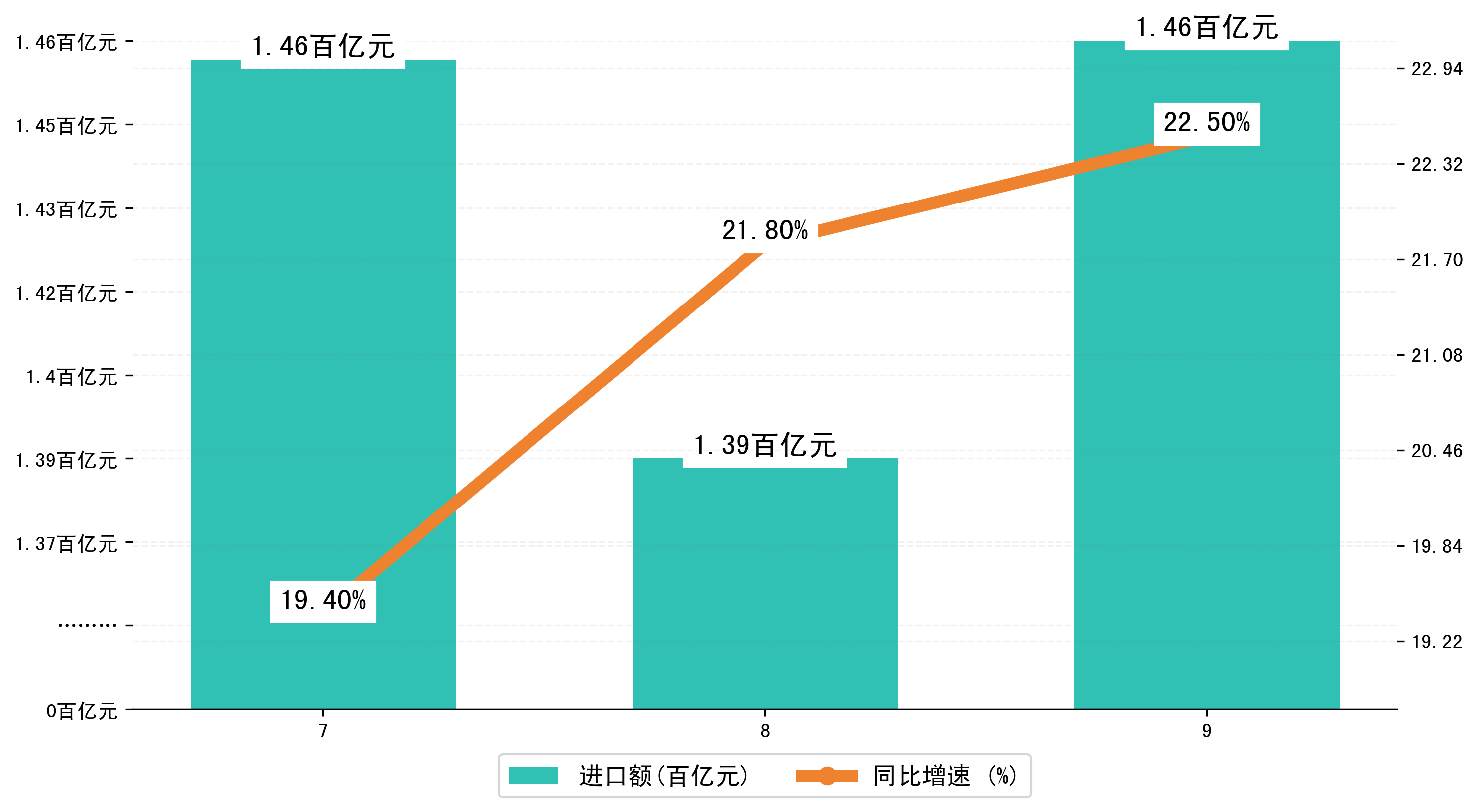 以人民币计,2023年9月惠州市进口额为146,1614.1902万元,相比上月增加了7,4707.8846万元;相比上年同期增加了30,7650.216万元,同比增加了22.50%。