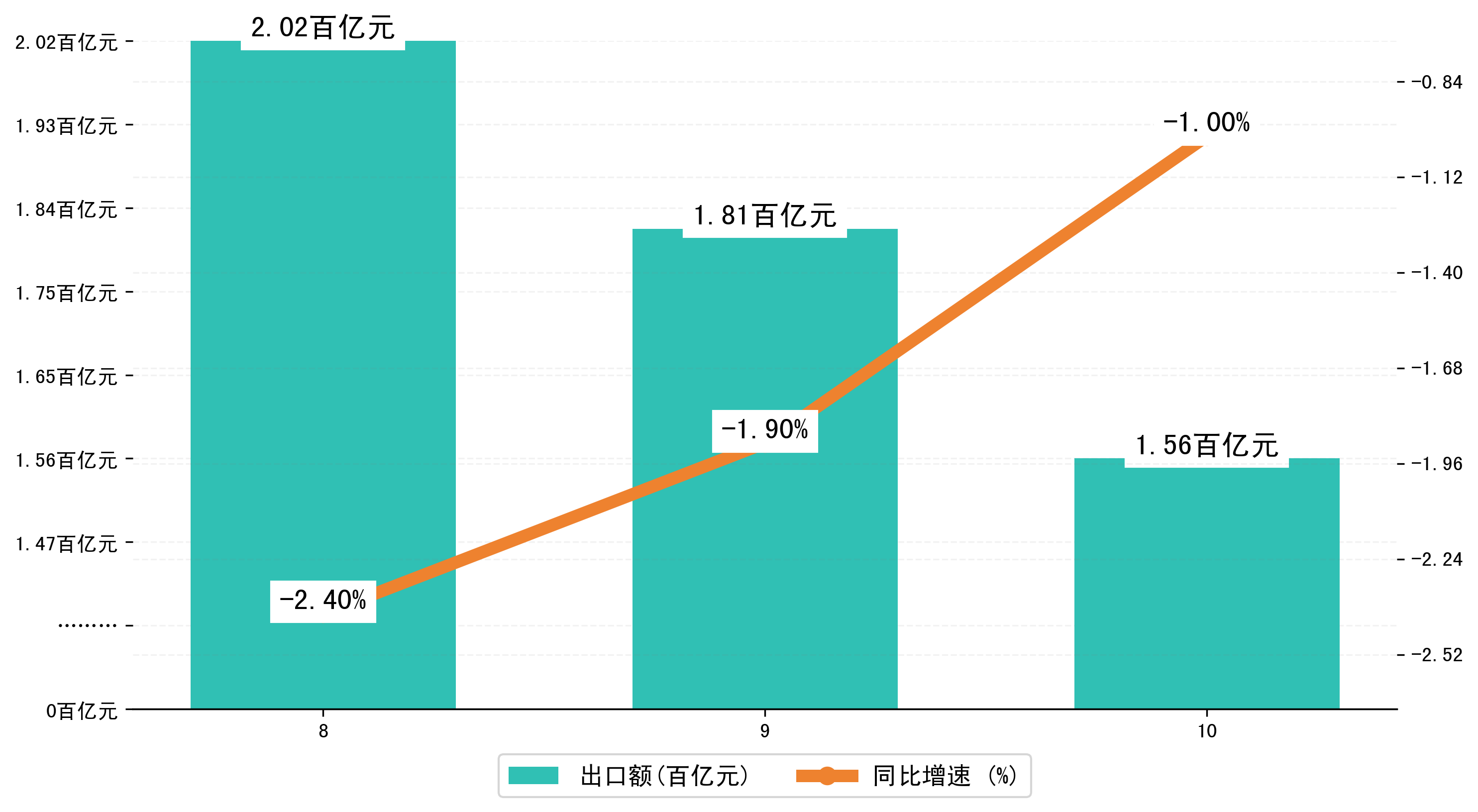以美元计,2023年1-10月惠州市出口额为242,5822.5559万美元,相比上年同期减少了18,6420.6673万美元,同比减少-7.10%。