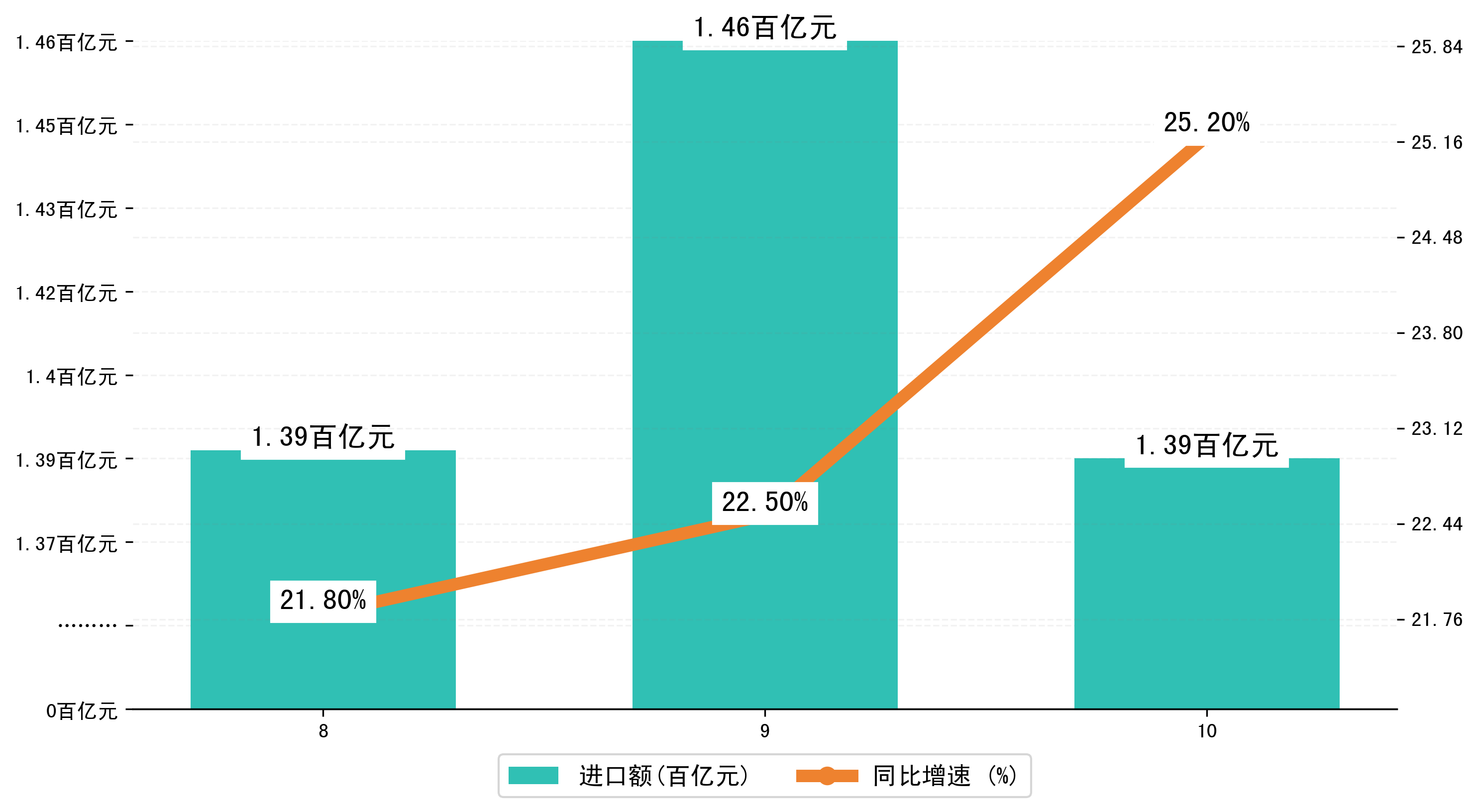 以人民币计,2023年10月惠州市进口额为138,5371.7015万元,相比上月减少了7,6242.4887万元;相比上年同期增加了45,1673.6885万元,同比增加了25.20%。