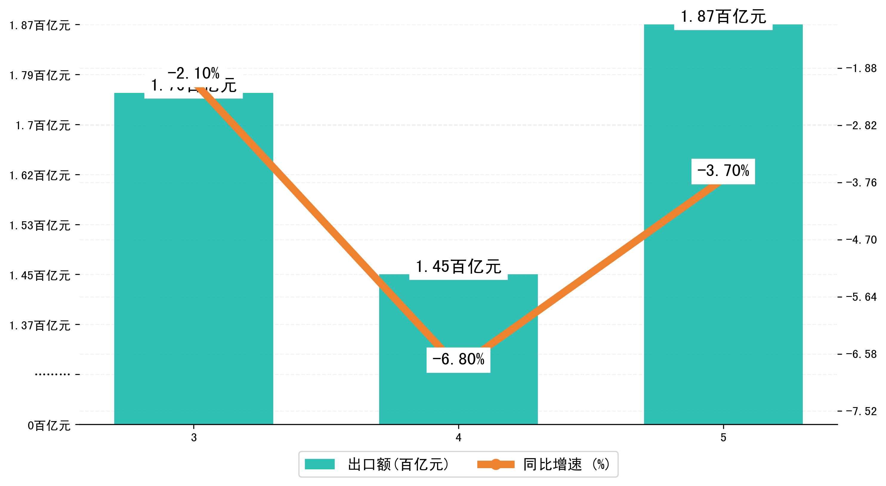 以人民币计,2023年5月惠州市出口额为187,0369.447万元,相比上月增加了41,9288.8533万元;相比上年同期增加了13,1948.1366万元,同比减少了-3.70%。