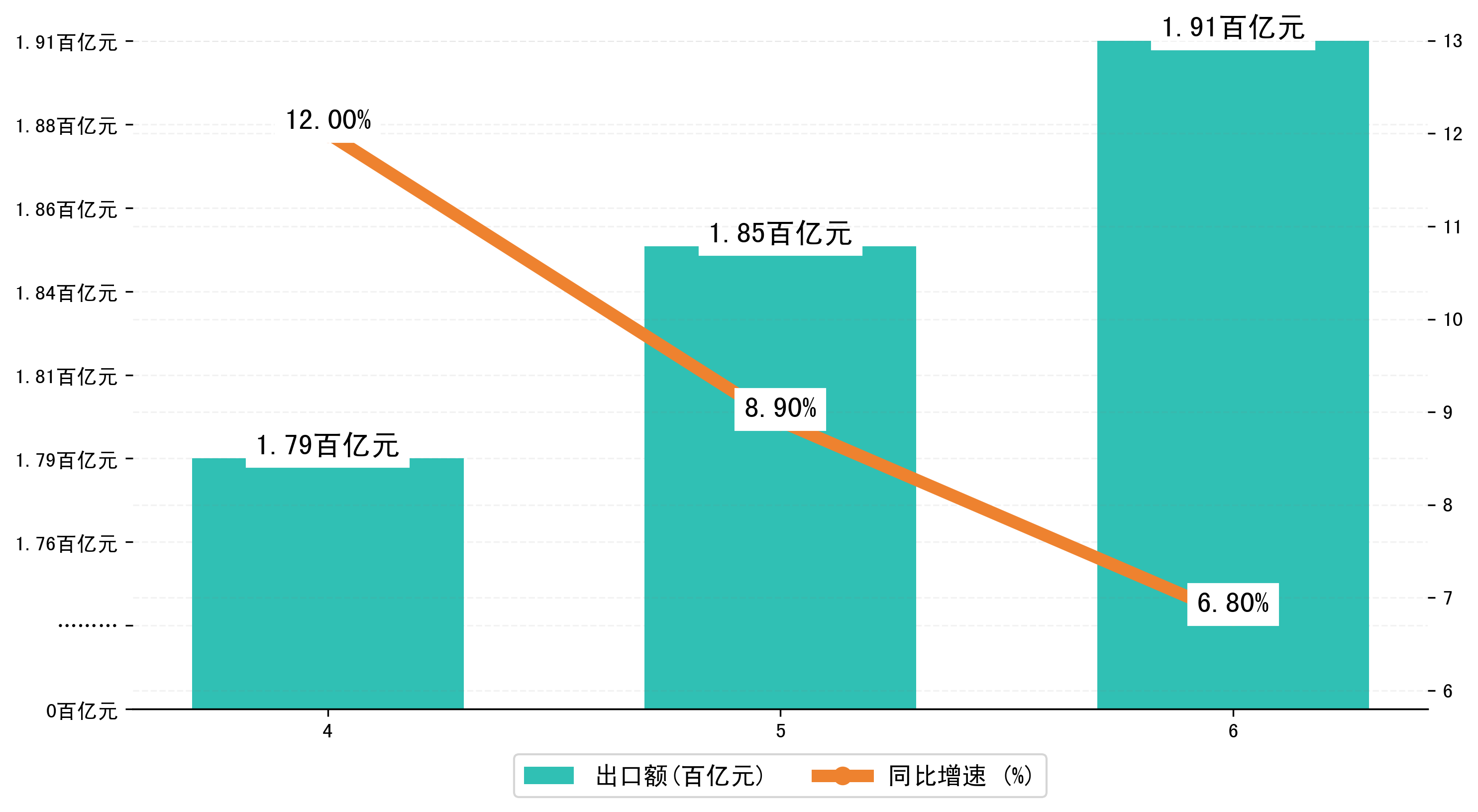 以人民币计,2024年6月惠州市出口额为190,7941.7059万元,相比上月增加了5,9209.1239万元;相比上年同期减少了3,3066.1096万元,同比增加了6.80%。