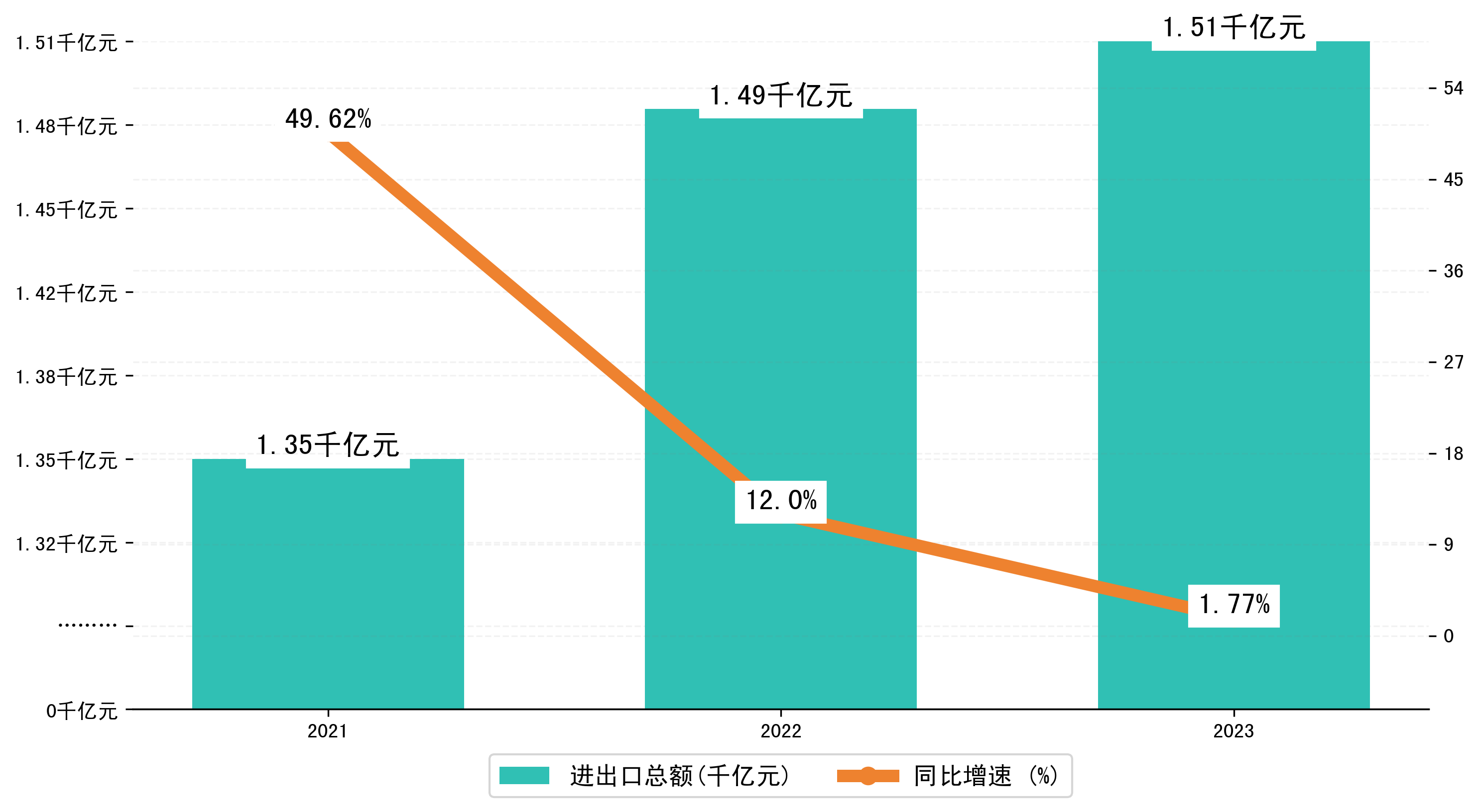 以人民币计,2023年1-6月惠州市进出口总额为1513,7712.3476万元,相比上年同期增加了26,3638.9186万元,同比增加了1.70%。