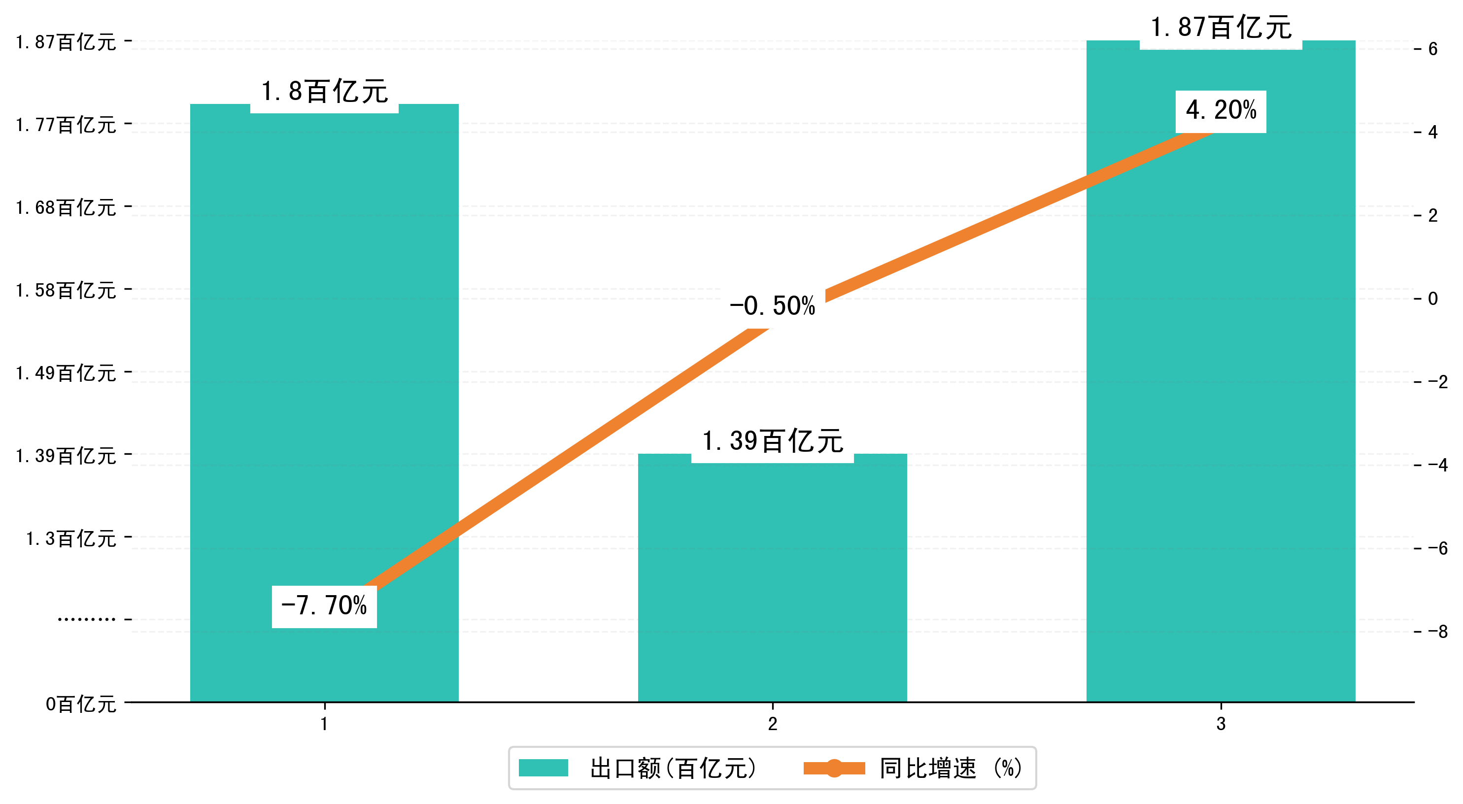 以人民币计,2025年3月惠州市出口额为186,9330.753万元,相比上月增加了47,4552.0137万元;相比上年同期增加了22,0957.5295万元,同比增加了4.20%。