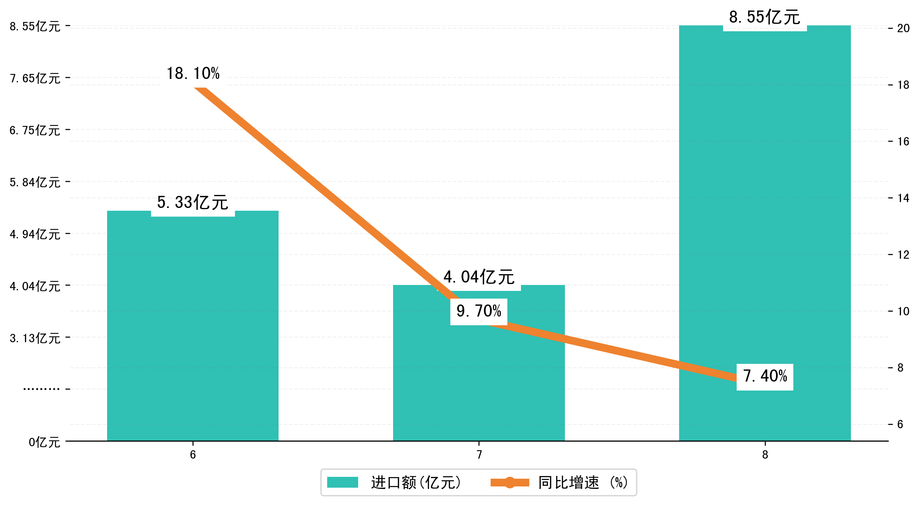 以人民币计,2024年1-8月珲春市进口额为71,0828.9662万元,相比上年同期增加了4,3710.4515万元,同比增加了7.40%。