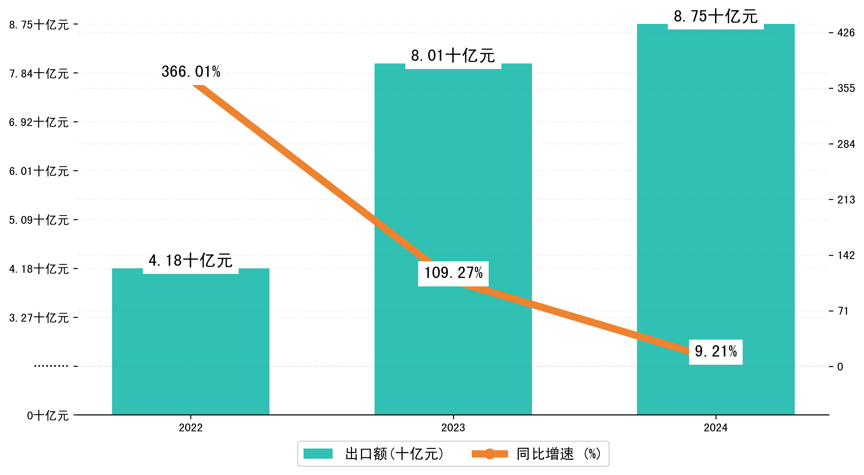 以人民币计,2024年1-11月珲春市出口额为87,4989.2875万元,相比上年同期增加了7,3798.6721万元,同比增加了9.20%。