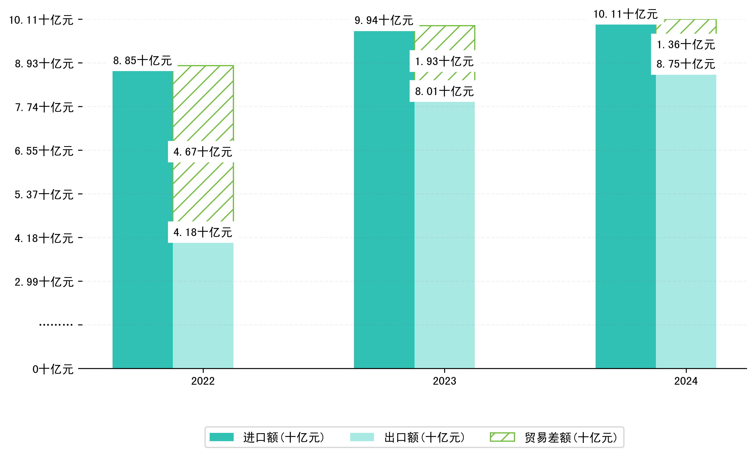 以人民币计,2024年11月珲春市贸易差额为2,8967,7807万元(贸易逆差),相比上月减少了1,1259,2992万元,即1677,0109万美元;相比上年同期减少了9,5421,7435万元,同比减少-143.59%。