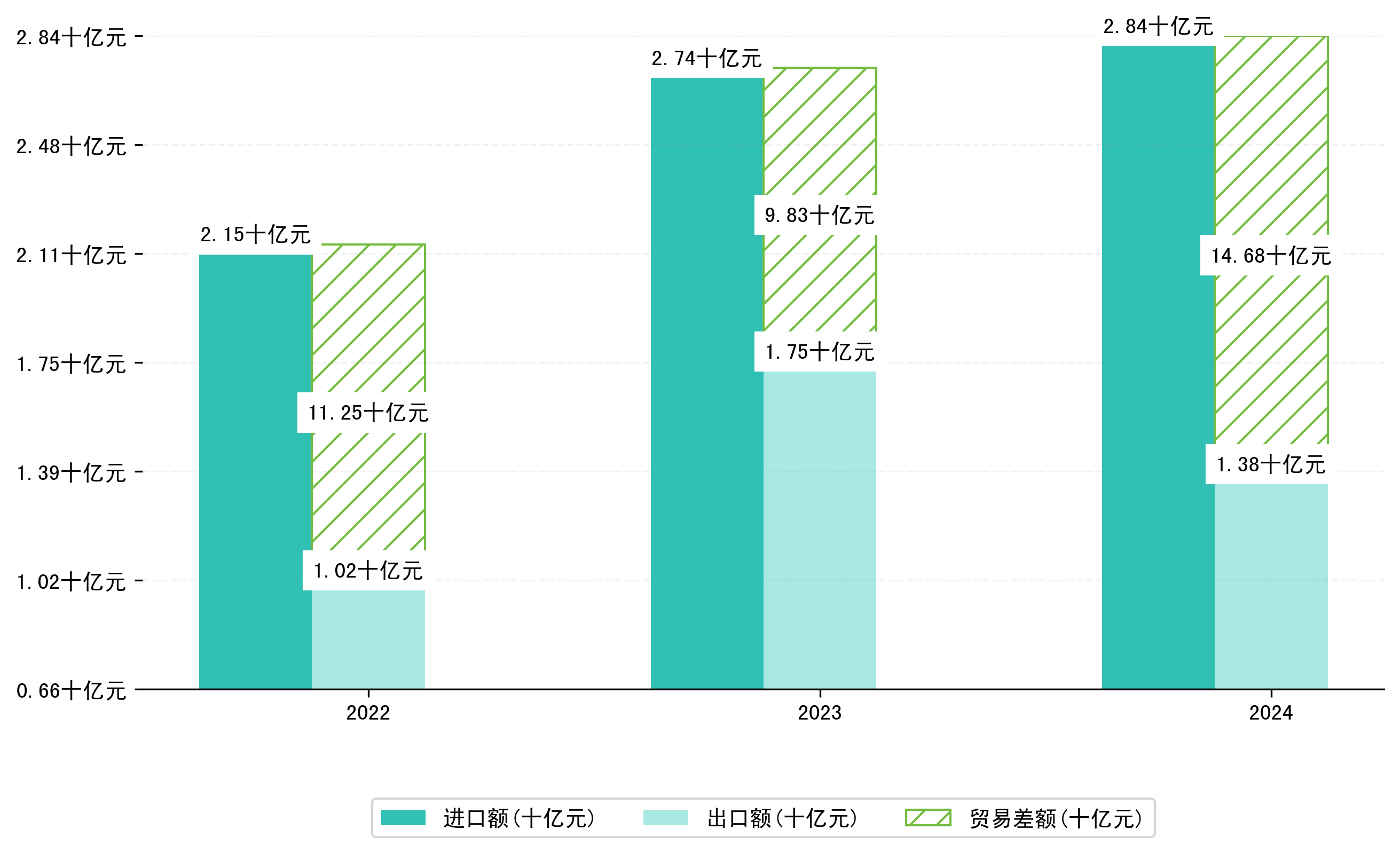 以人民币计,2024年1-3月珲春市贸易差额为14,6771,1529万元(贸易逆差),相比上年同期减少了4,8476,5235万元,同比减少49.32%。