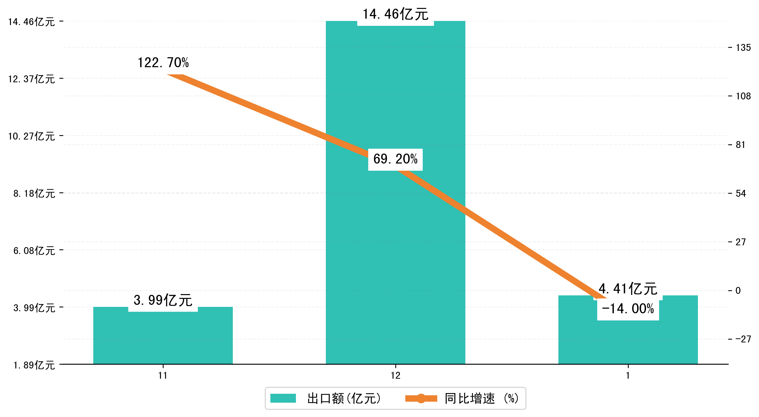 以人民币计,2023年1-1月珲春市出口额为4,4108.4417万元,相比上年同期减少了7203.5439万元,同比减少了-14.00%。