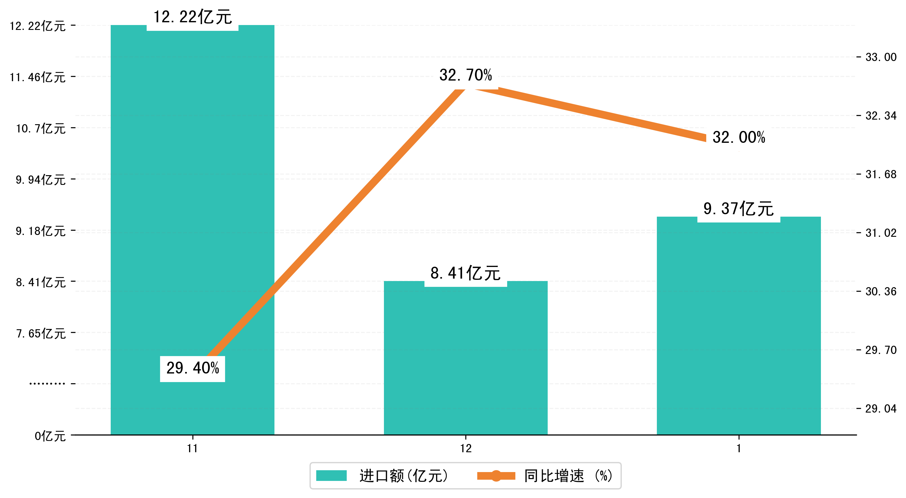以人民币计,2023年1月珲春市进口额为9,3717.7859万元,相比上月增加了9584.9365万元;相比上年同期增加了2,2308.704万元,同比增加了32.00%。