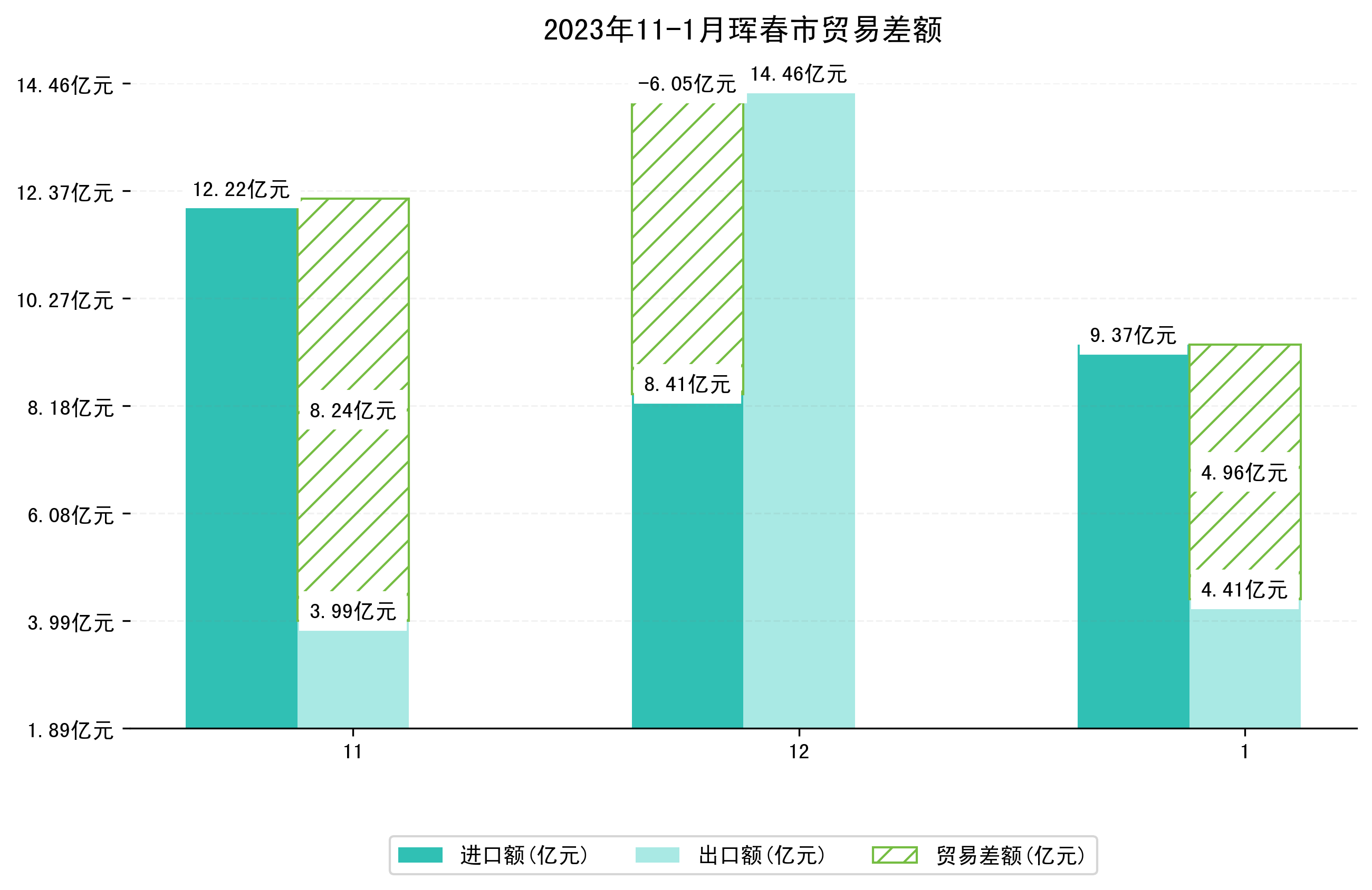 以人民币计,2023年1-1月珲春市贸易差额为4,9609,3442万元(贸易逆差),相比上年同期减少了2,9512,2479万元,同比减少146.85%。
