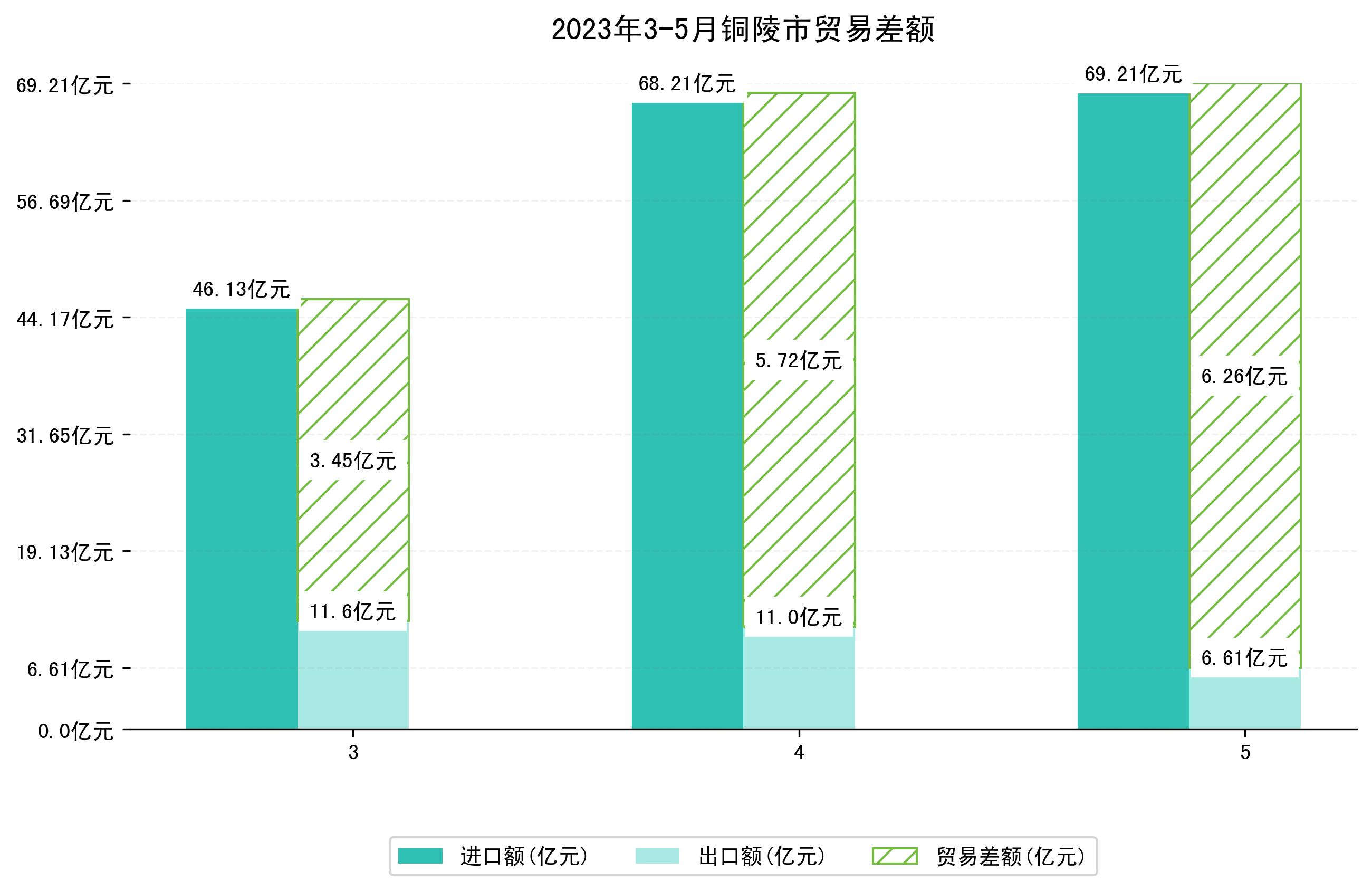 以人民币计,2023年5月铜陵市贸易差额为62,5970,1974万元(贸易逆差),相比上月减少了5,3861,6555万元,即7805,3649万美元;相比上年同期减少了1,2439,8939万元,同比减少2.03%。