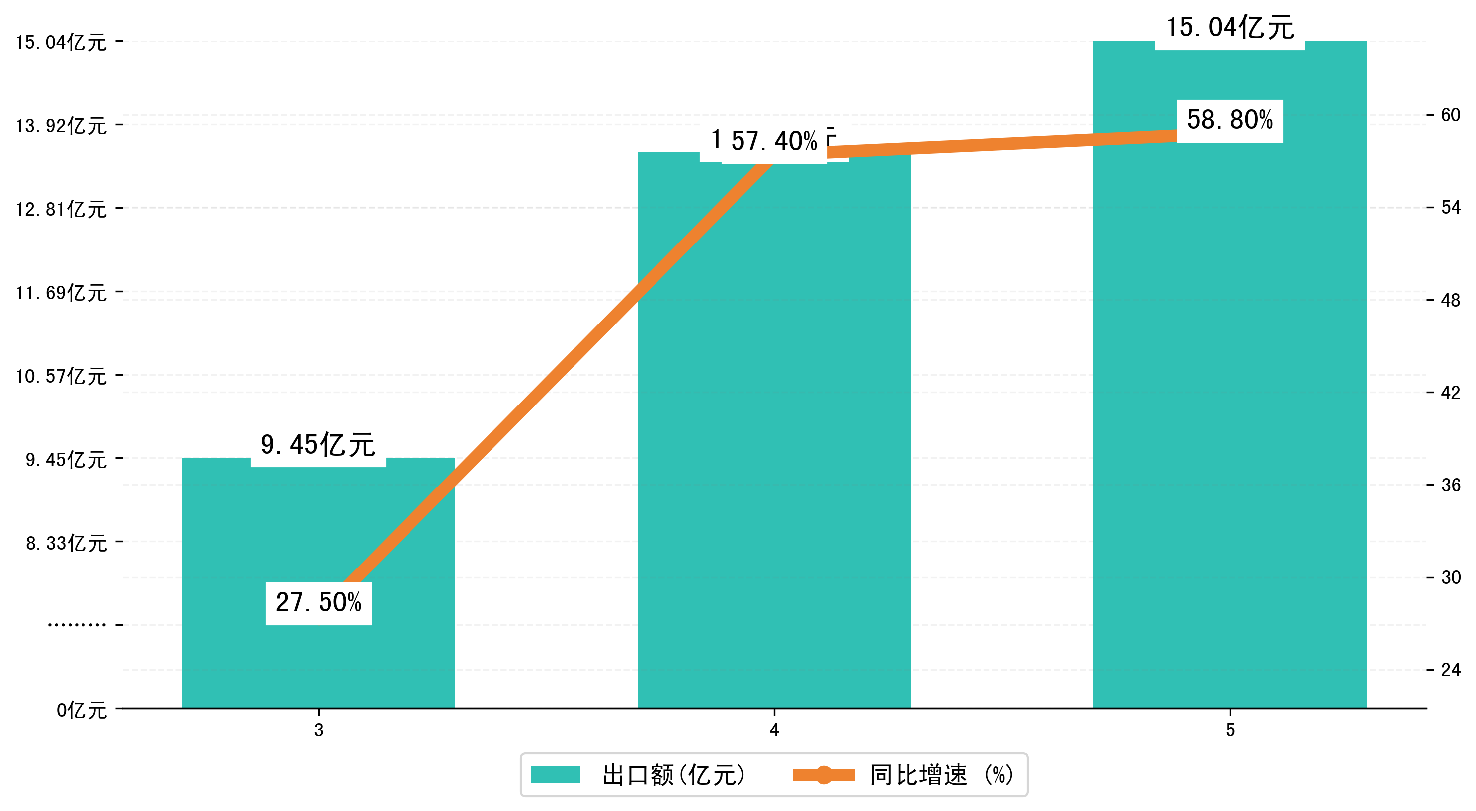 以人民币计,2025年5月珲春市出口额为15,0435.9474万元,相比上月增加了1,4927.7027万元;相比上年同期增加了5,7423.7704万元,同比增加了58.80%。