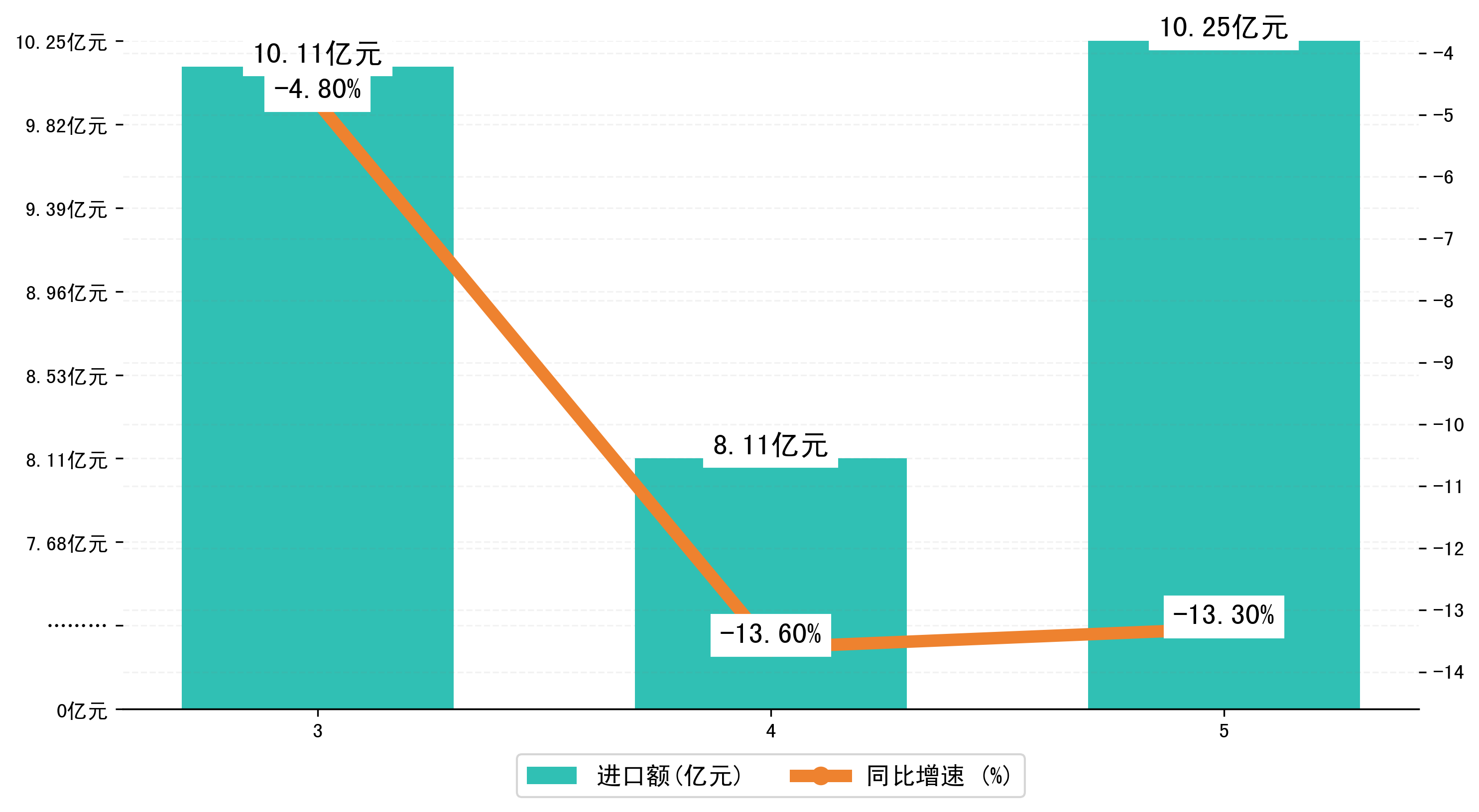 以人民币计,2025年5月珲春市进口额为10,2455.3435万元,相比上月增加了2,1382.4963万元;相比上年同期减少了8444.0492万元,同比减少了-13.30%。