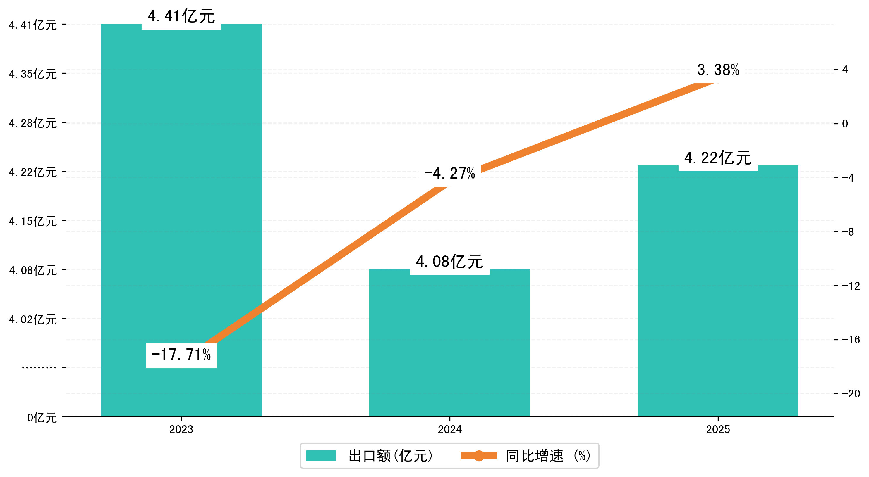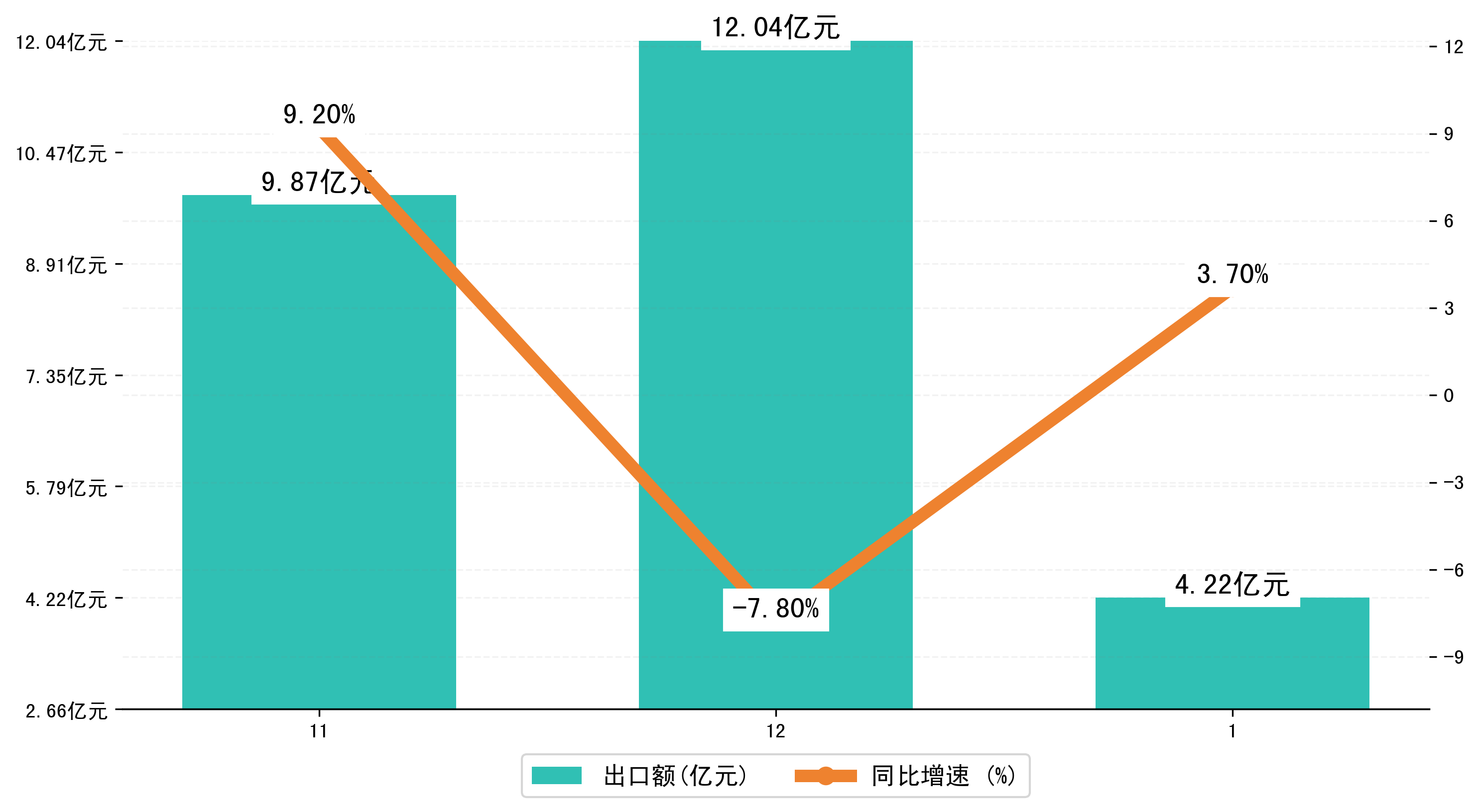以美元计,2025年1-1月珲春市出口额为5871.6944万美元,相比上年同期增加了111.9151万美元,同比增加2.30%。