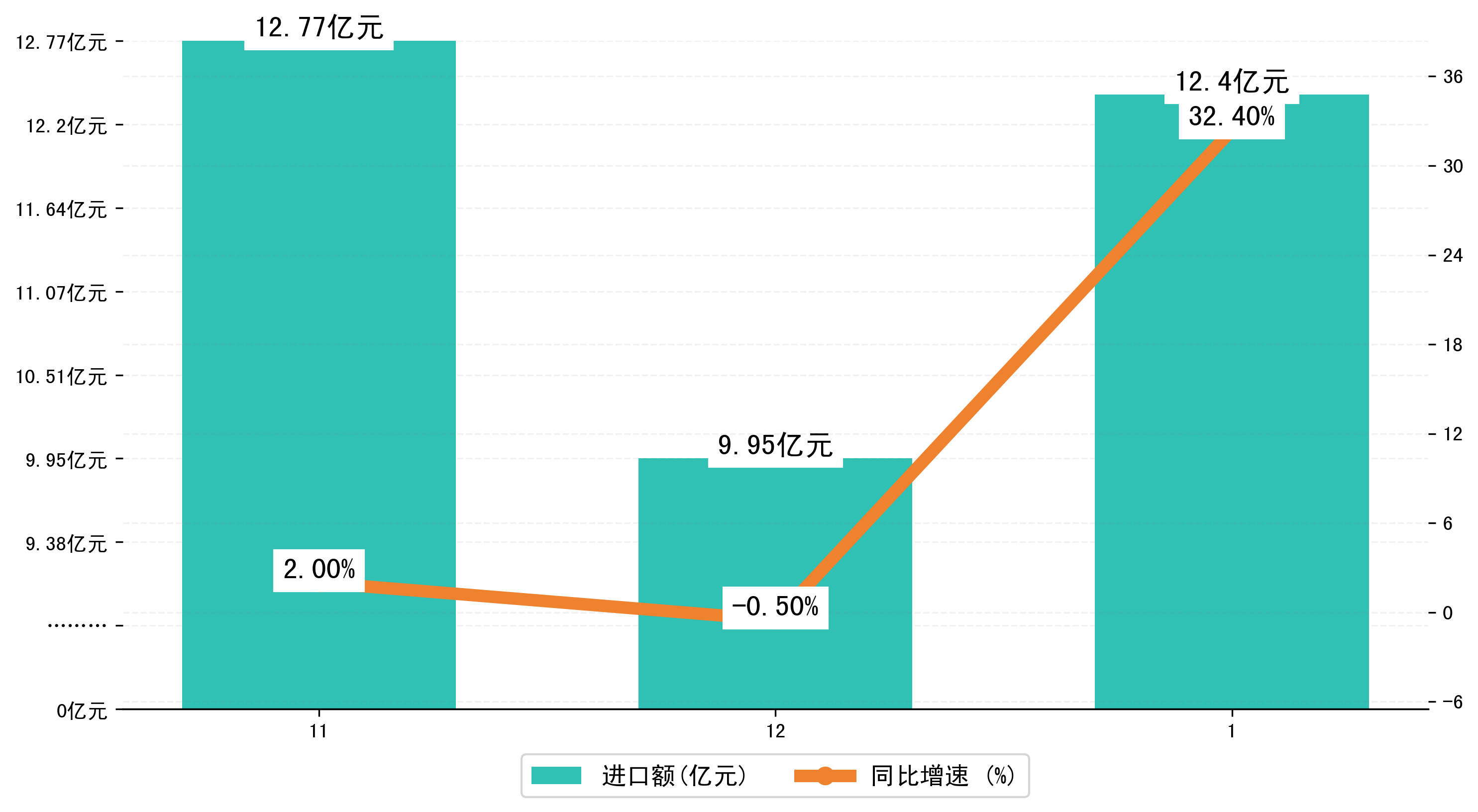 以人民币计,2025年1月珲春市进口额为12,4017.7992万元,相比上月增加了2,4567.3558万元;相比上年同期增加了3,2863.5958万元,同比增加了32.40%。
