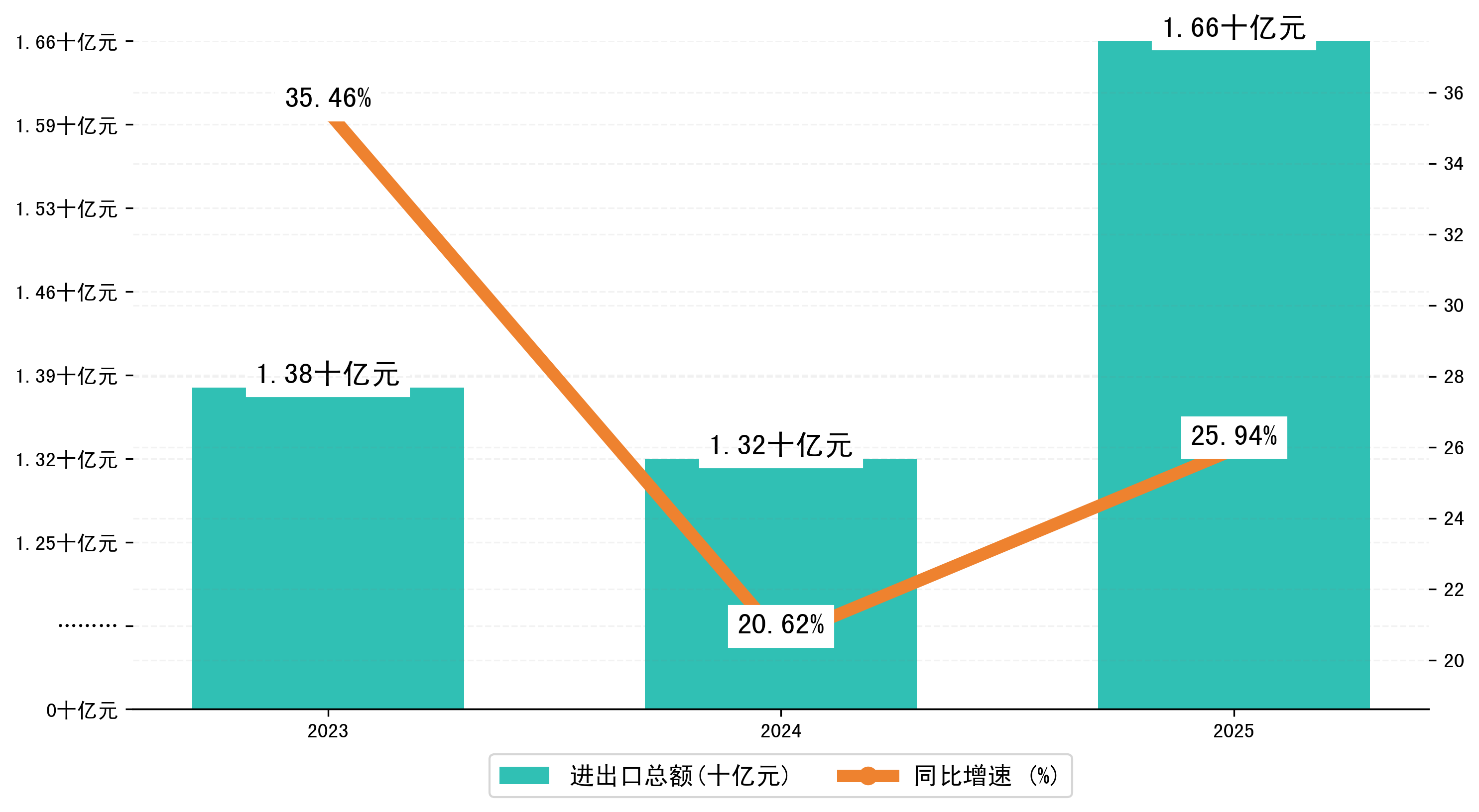 以人民币计,2025年1-1月珲春市进出口总额为16,6242.5804万元,相比上年同期增加了3,4242.9081万元,同比增加了23.70%。