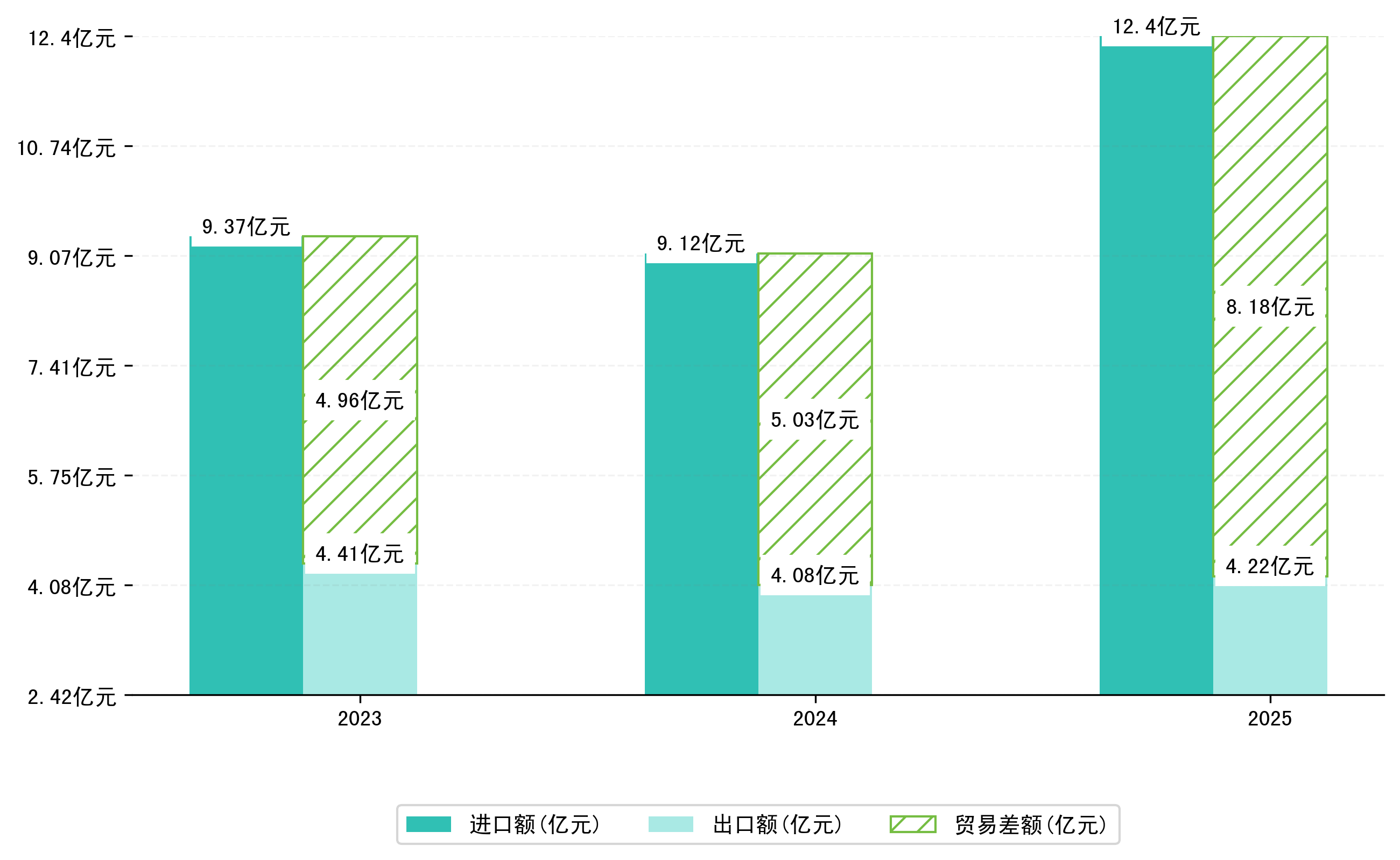 以人民币计,2025年1月珲春市贸易差额为8,1793,0180万元(贸易逆差),相比上月减少了10,2720,9392万元,即1,4300,8333万美元;相比上年同期减少了3,1484,2835万元,同比减少62.58%。