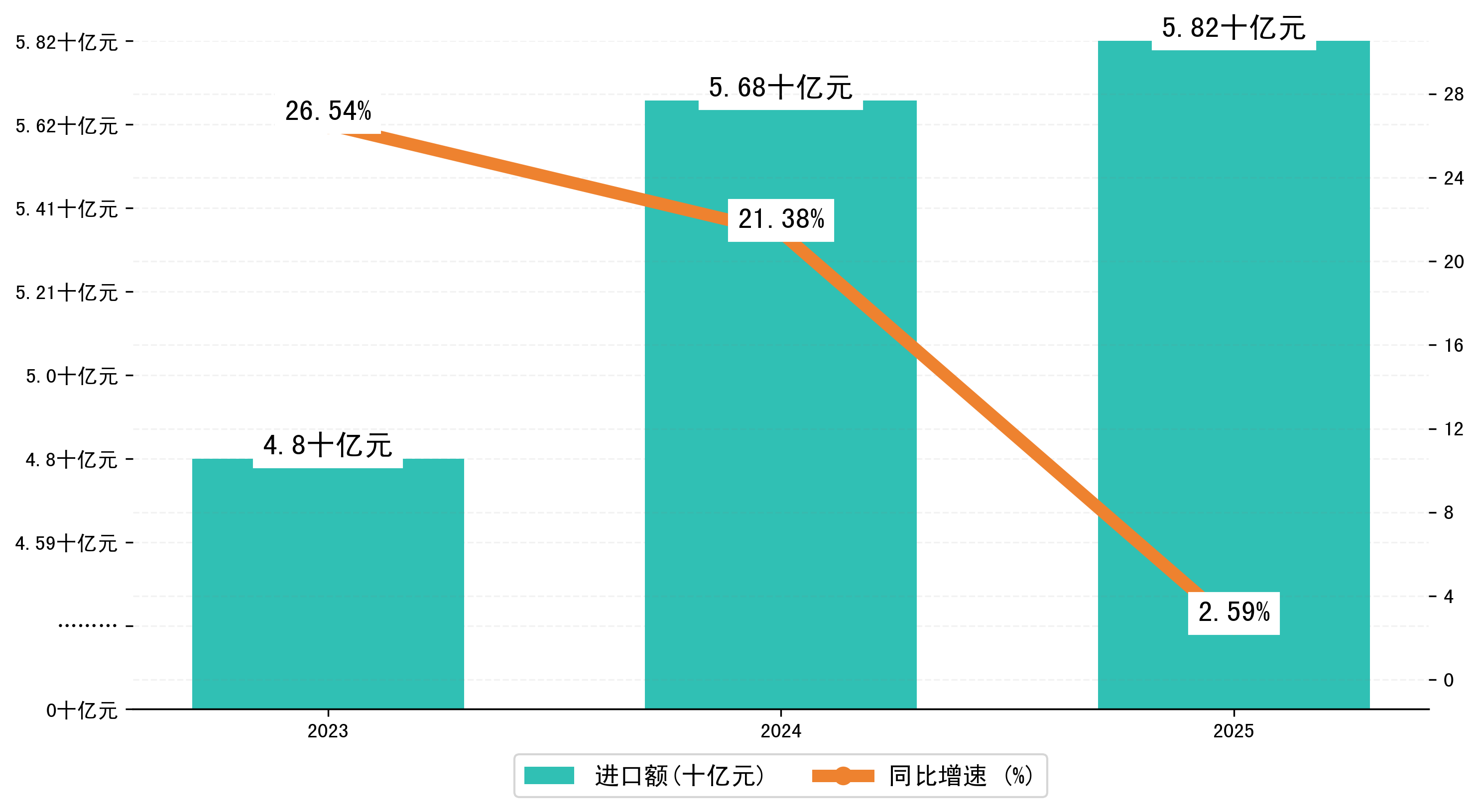 以人民币计,2025年1-6月珲春市进口额为58,2354.5273万元,相比上年同期增加了1,4683.6378万元,同比减少了-1.60%。