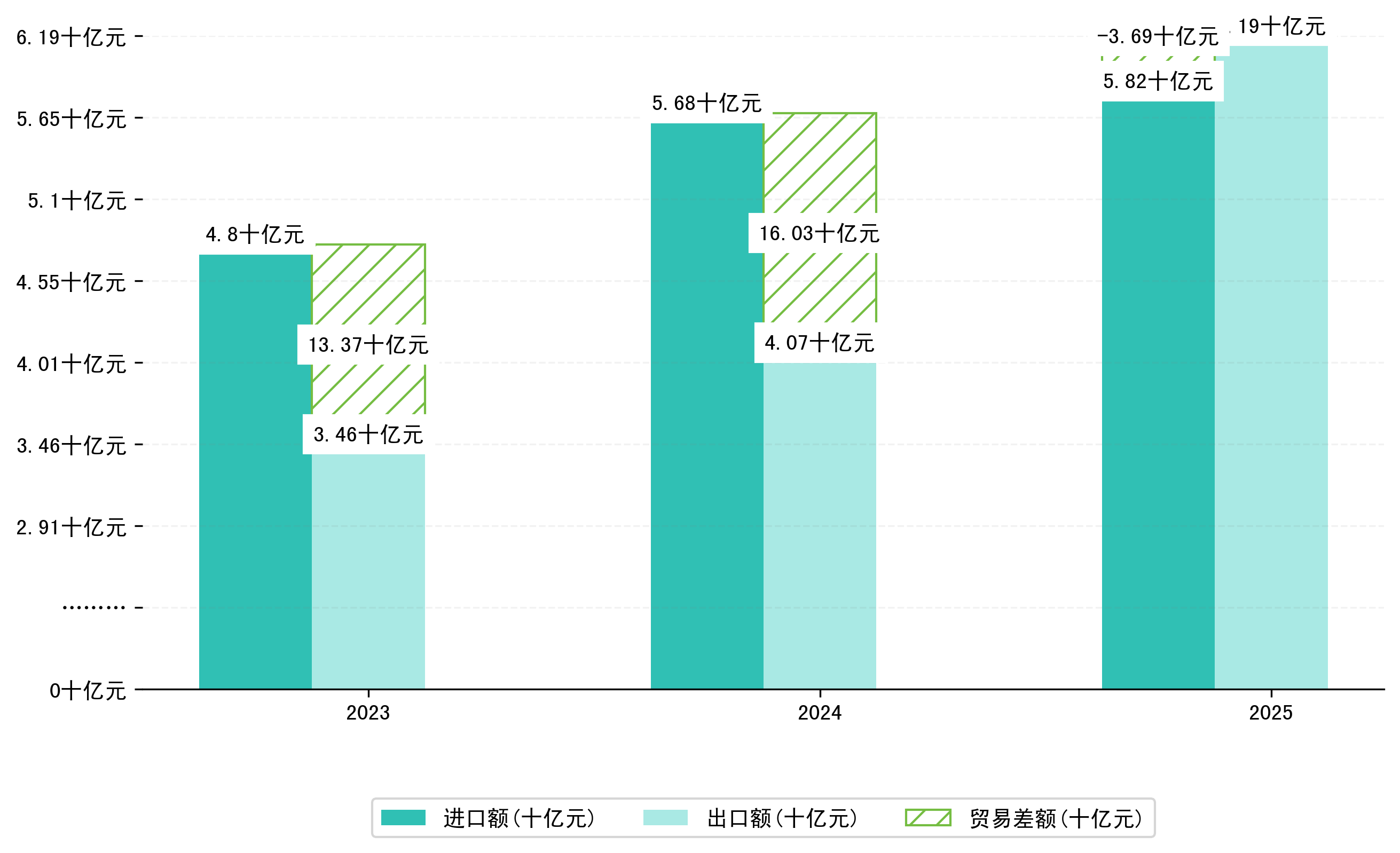 以人民币计,2025年1-6月珲春市贸易差额为3,6913,4408万元(贸易顺差),相比上年同期增加了19,7260,5517万元,同比增加-123.02%。