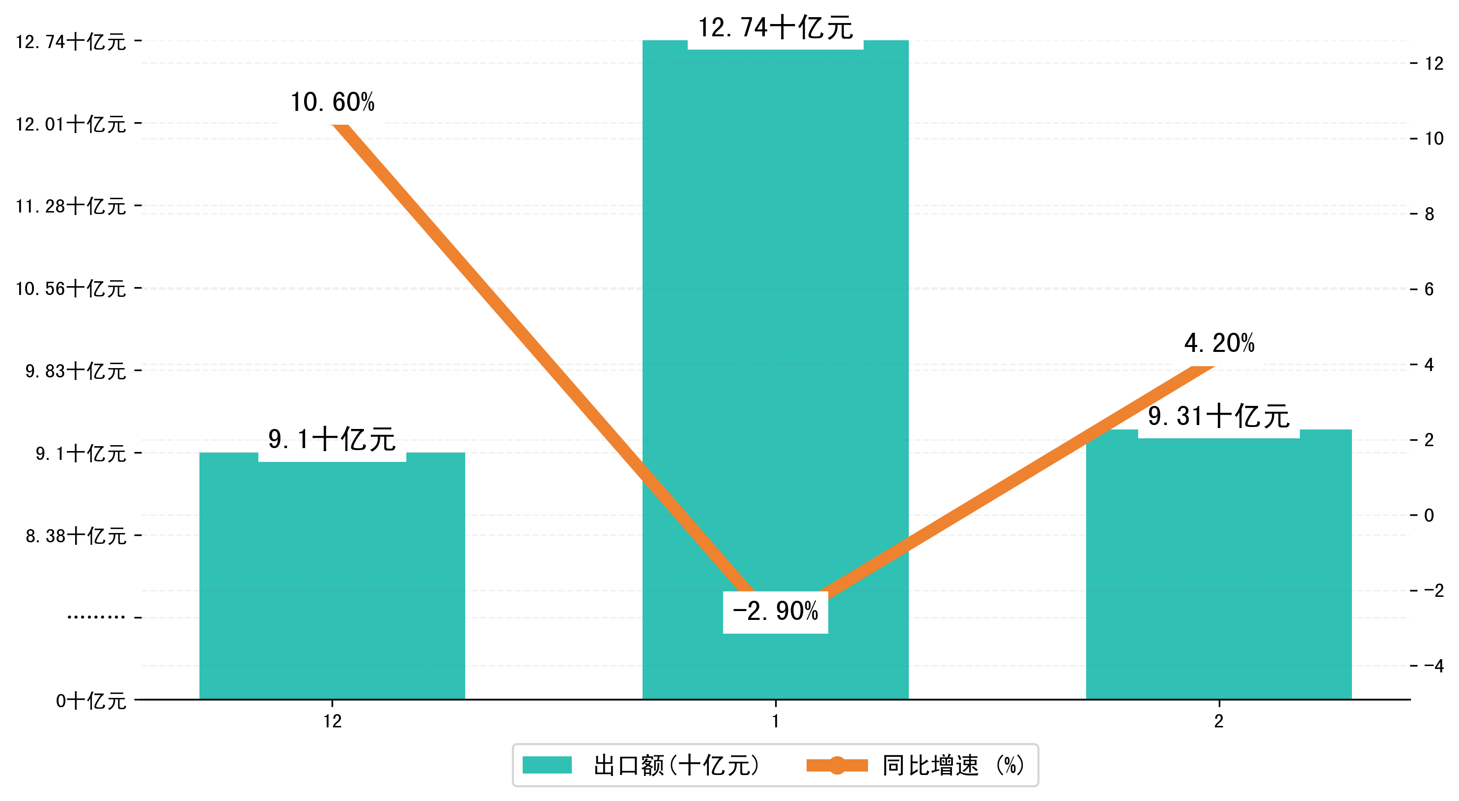 以人民币计,2023年1-2月湖州市出口额为220,4374.2462万元,相比上年同期增加了8,3765.8528万元,同比增加了4.20%。