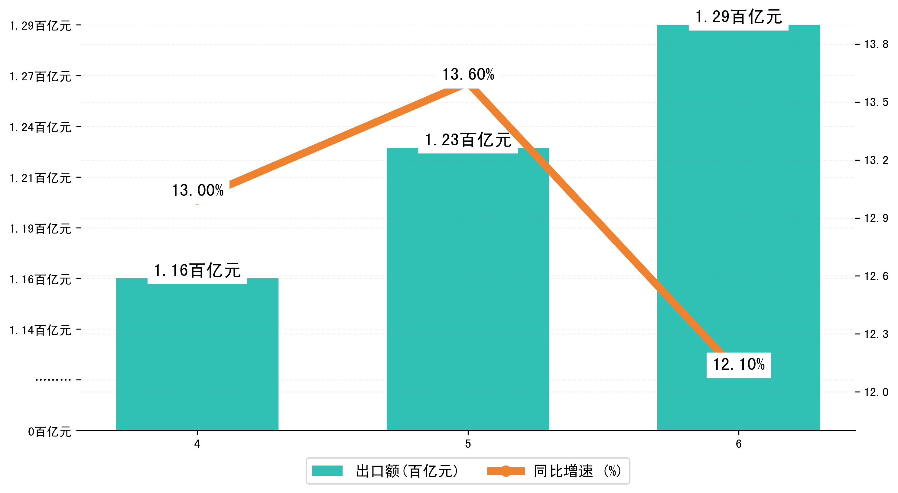 以人民币计,2024年6月湖州市出口额为129,1077.1291万元,相比上月增加了6,2980.2273万元;相比上年同期增加了6,0045.7011万元,同比增加了12.10%。