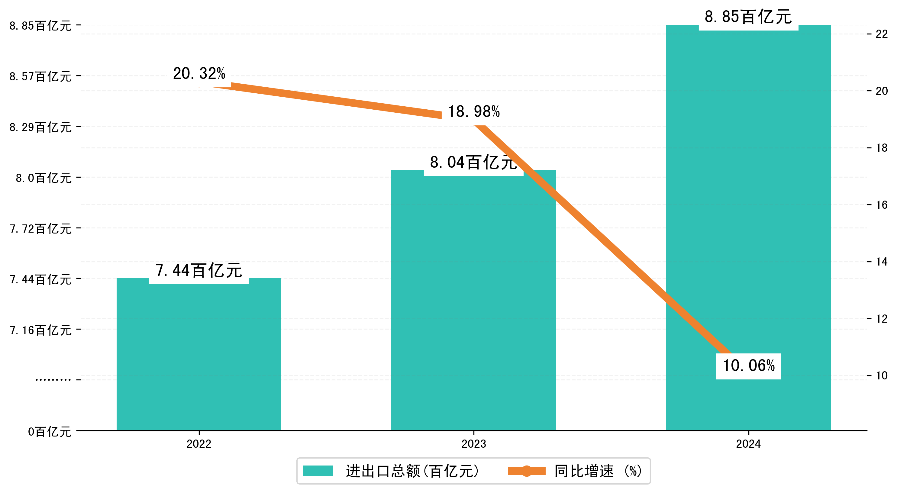 以人民币计,2024年1-6月湖州市进出口总额为885,1046.7785万元,相比上年同期增加了80,9005.7688万元,同比增加了11.10%。