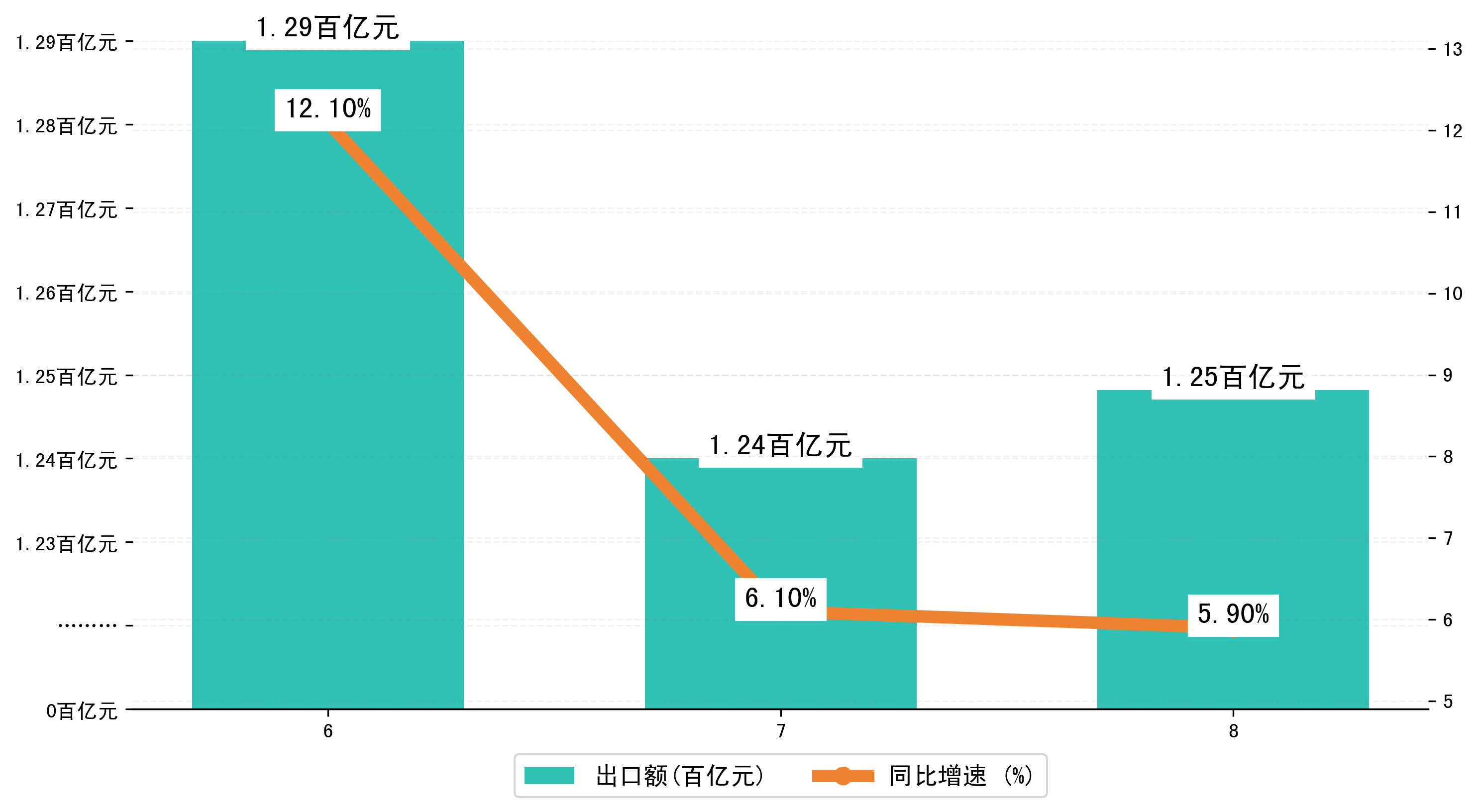 以人民币计,2024年8月湖州市出口额为125,0344.9709万元,相比上月增加了7982.7289万元;相比上年同期增加了4,3846.5905万元,同比增加了5.90%。