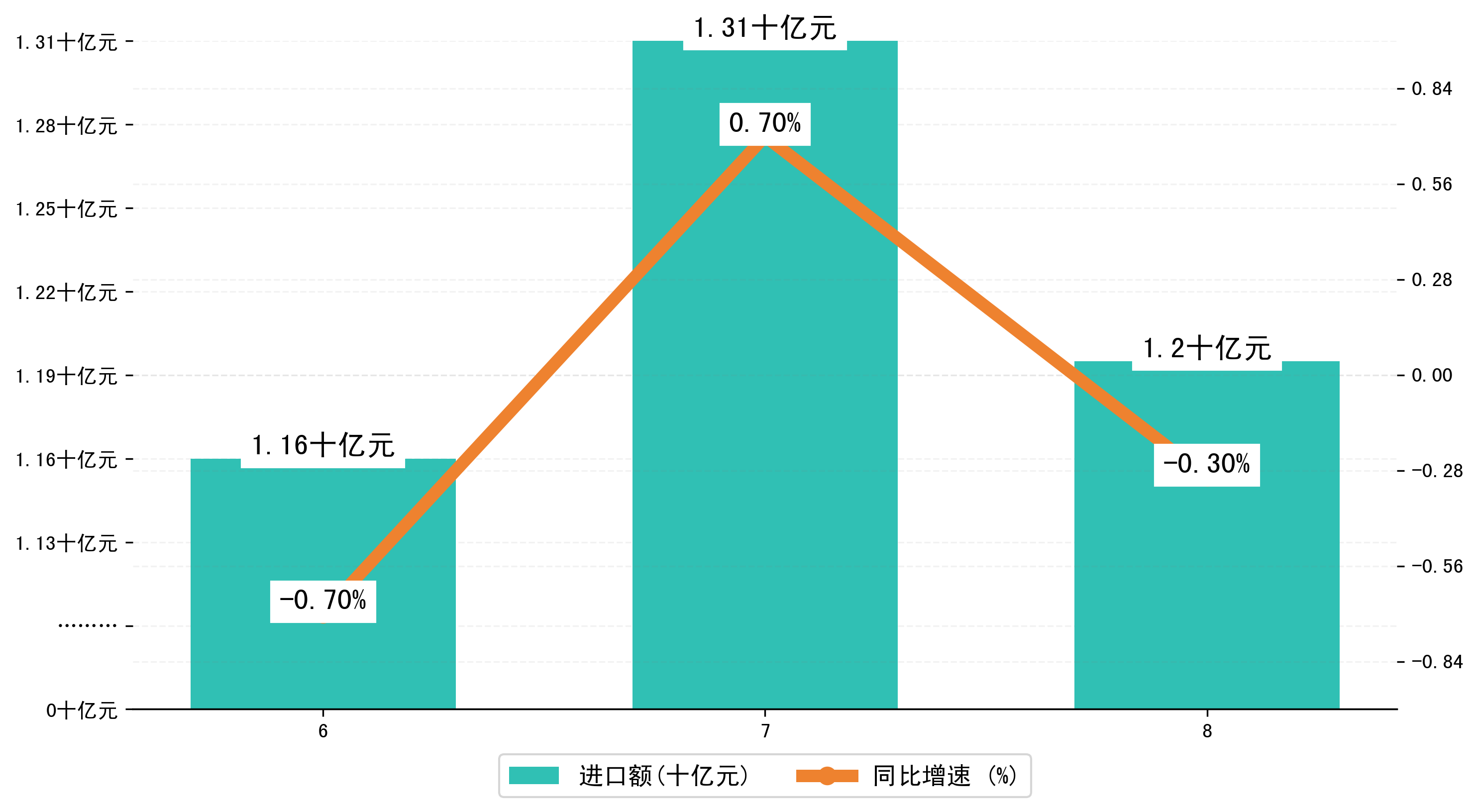 以人民币计,2024年1-8月湖州市进口额为88,7086.7638万元,相比上年同期增加了1479.1644万元,同比减少了-0.30%。