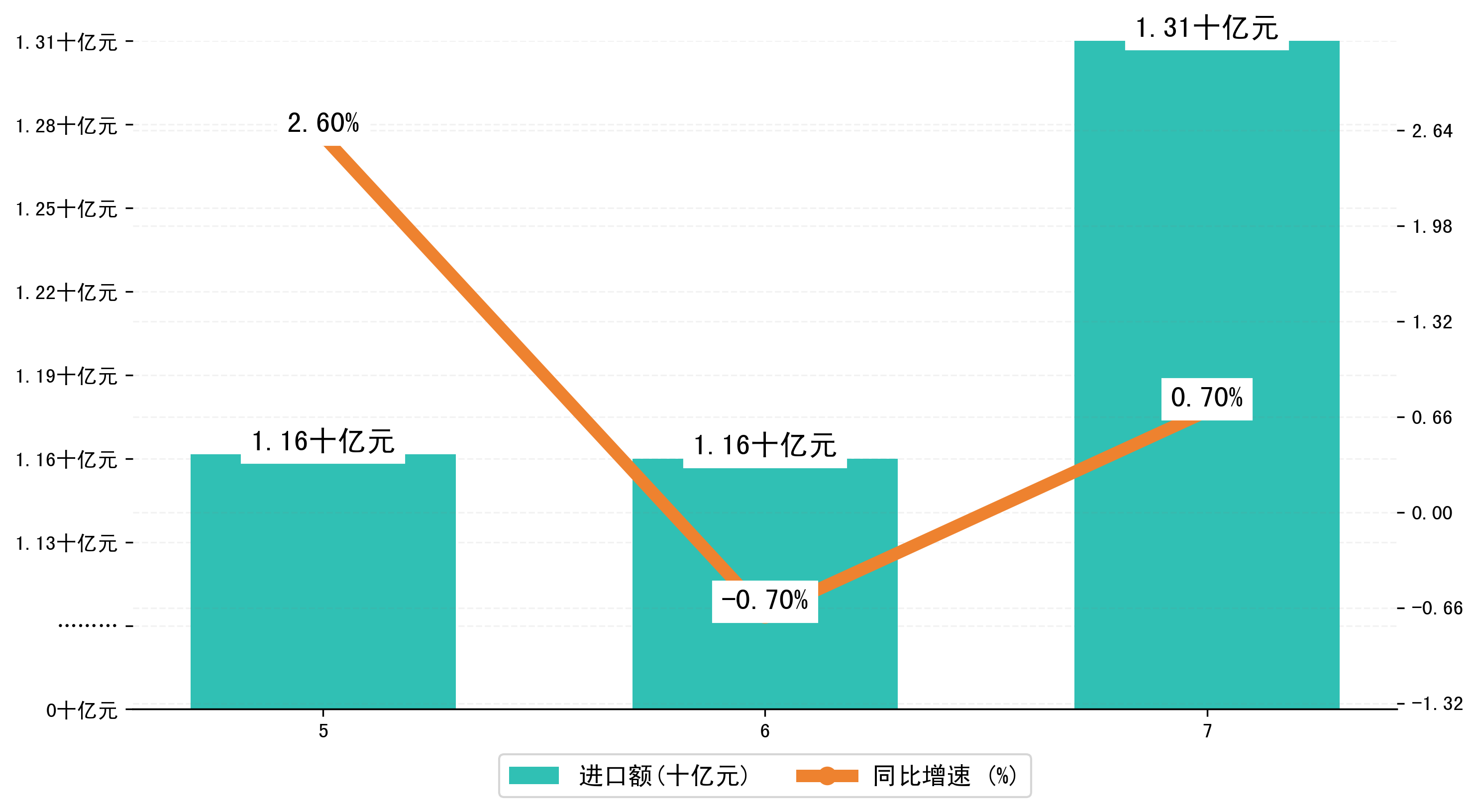 以人民币计,2024年7月湖州市进口额为13,0952.3417万元,相比上月增加了1,4856.3926万元;相比上年同期增加了1,0484.2789万元,同比增加了0.70%。