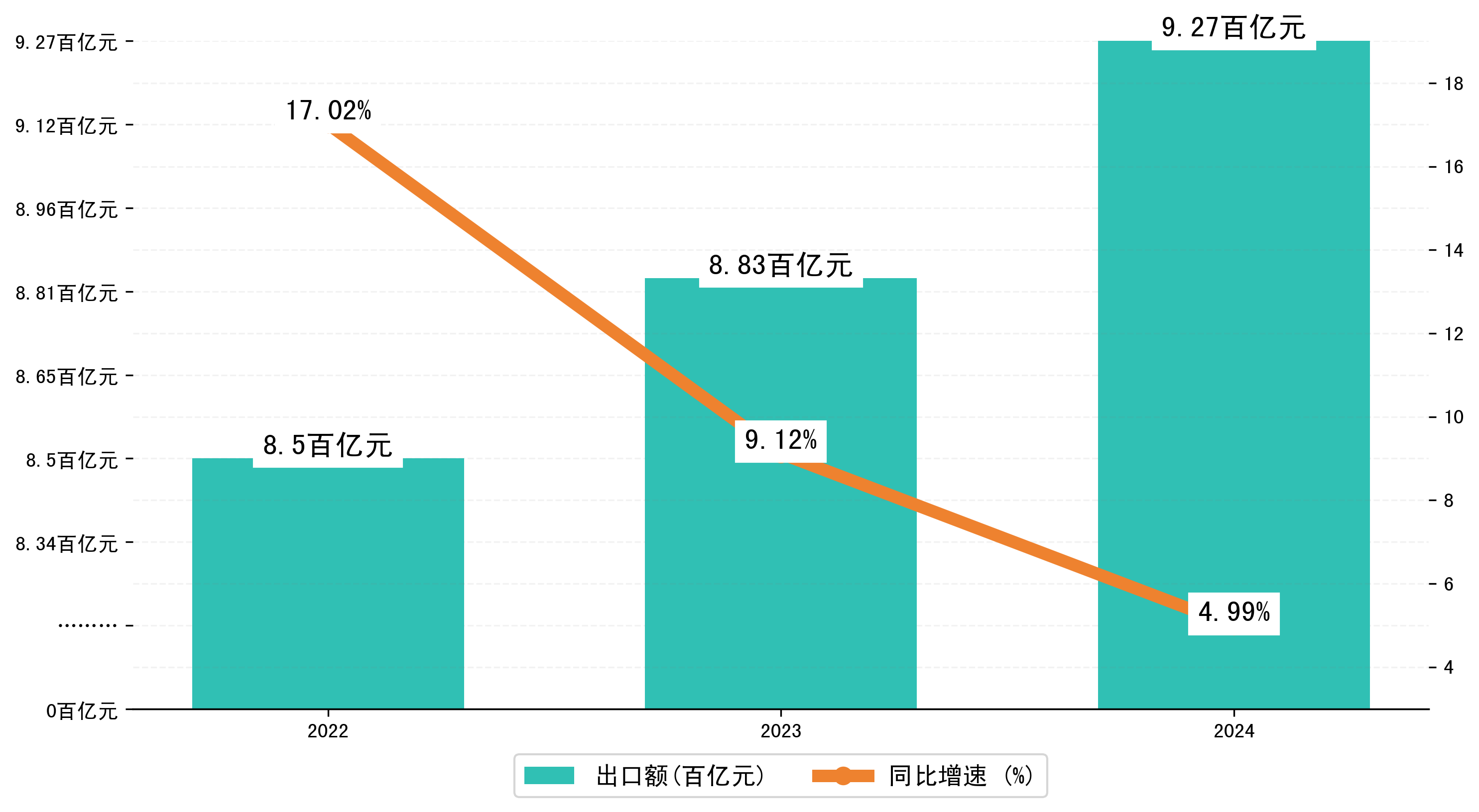 以人民币计,2024年1-7月湖州市出口额为927,0084.942万元,相比上年同期增加了44,0196.4517万元,同比增加了6.10%。