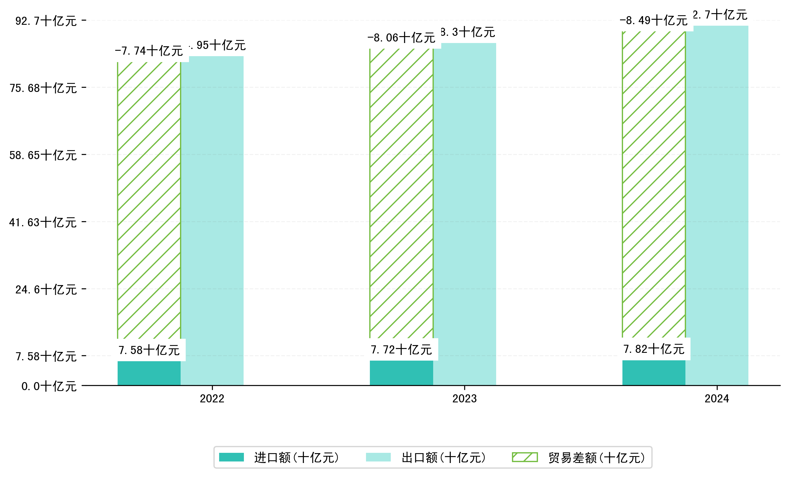 以人民币计,2024年1-7月湖州市贸易差额为848,8059,6306万元(贸易顺差),相比上年同期增加了43,0636,4621万元,同比增加5.34%。