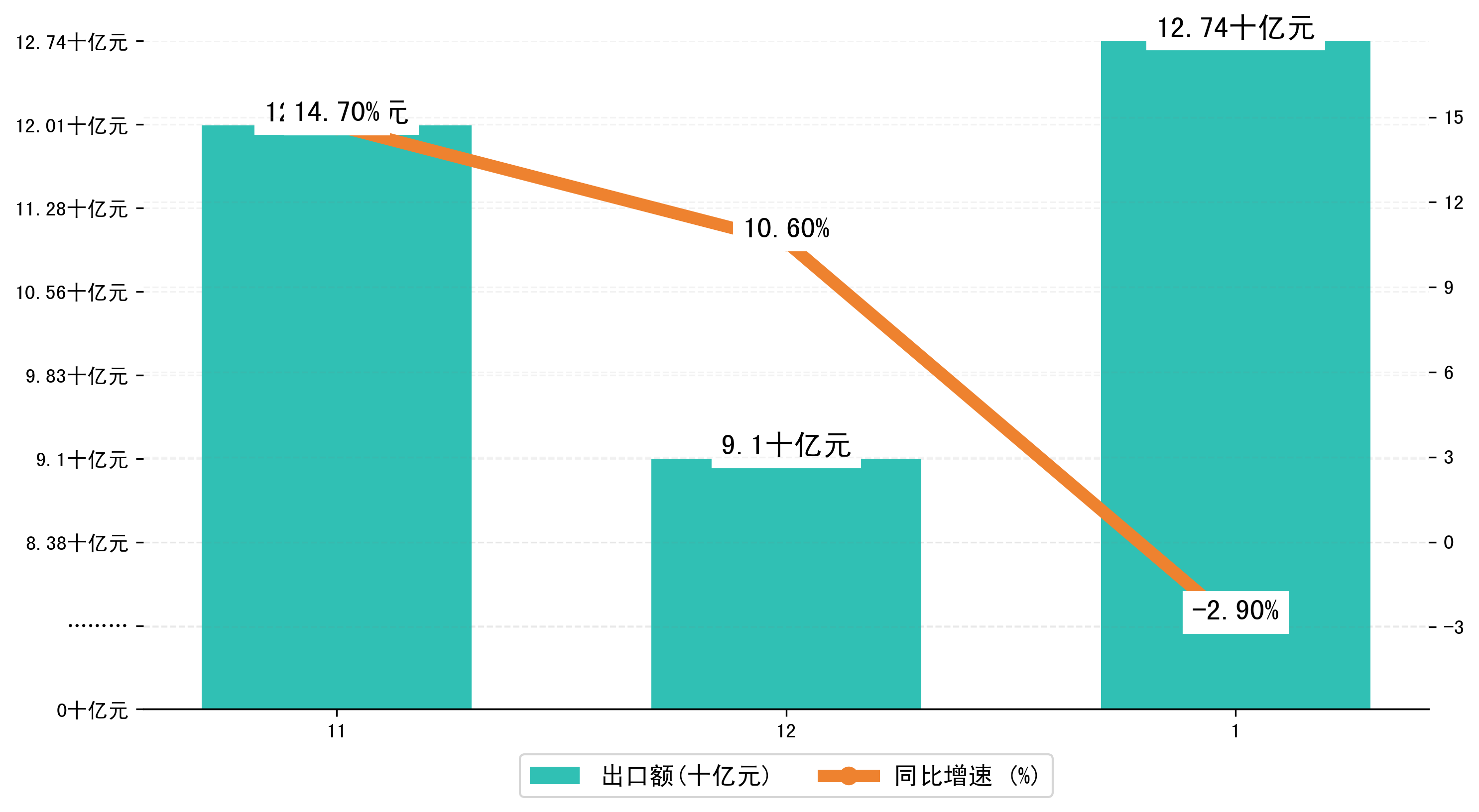 以人民币计,2023年1-1月湖州市出口额为127,3606.6018万元,相比上年同期减少了4,2528.8574万元,同比减少了-2.90%。