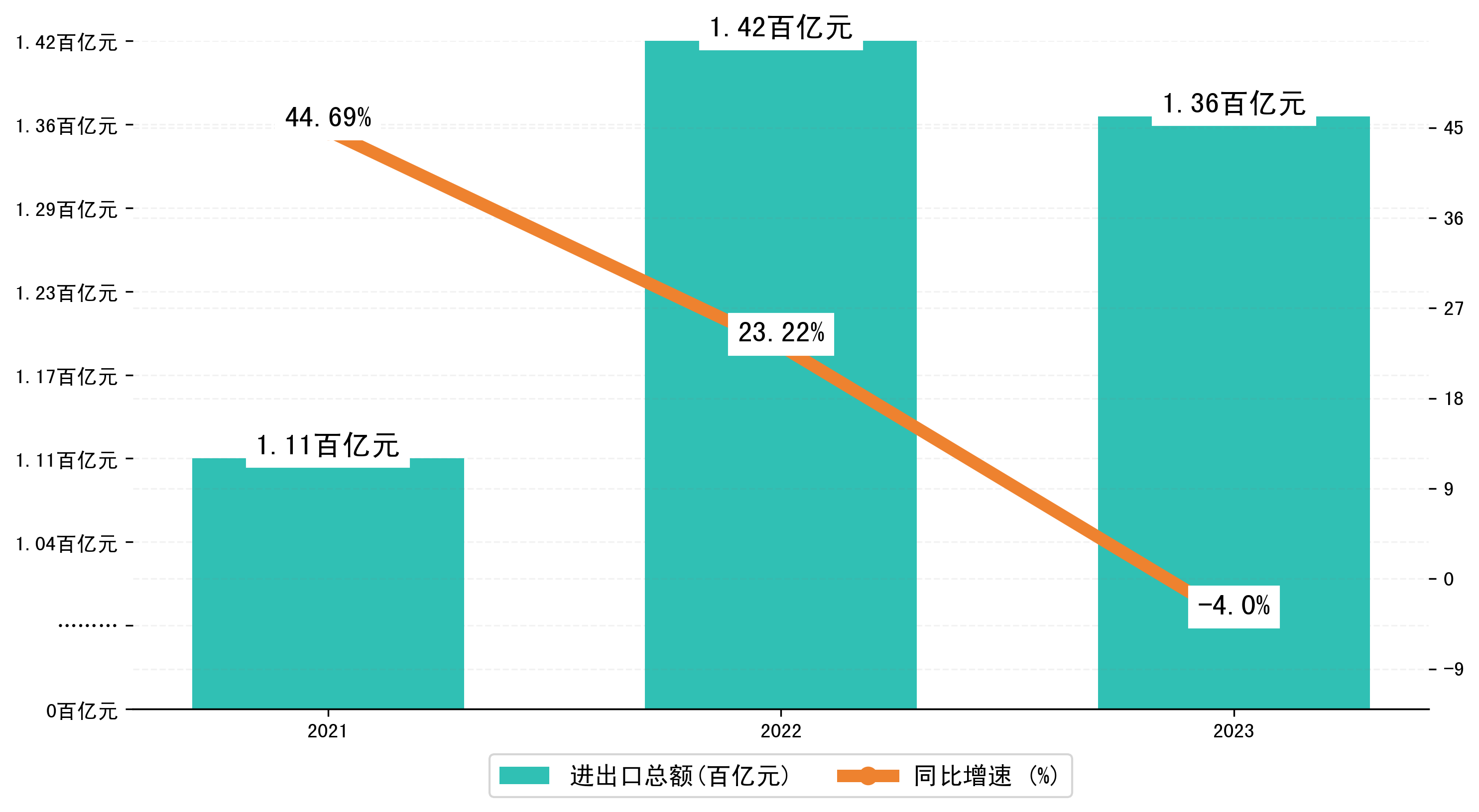 以人民币计,2023年1-1月湖州市进出口总额为136,3364.592万元,相比上年同期减少了5,6829.7709万元,同比减少了-3.80%。