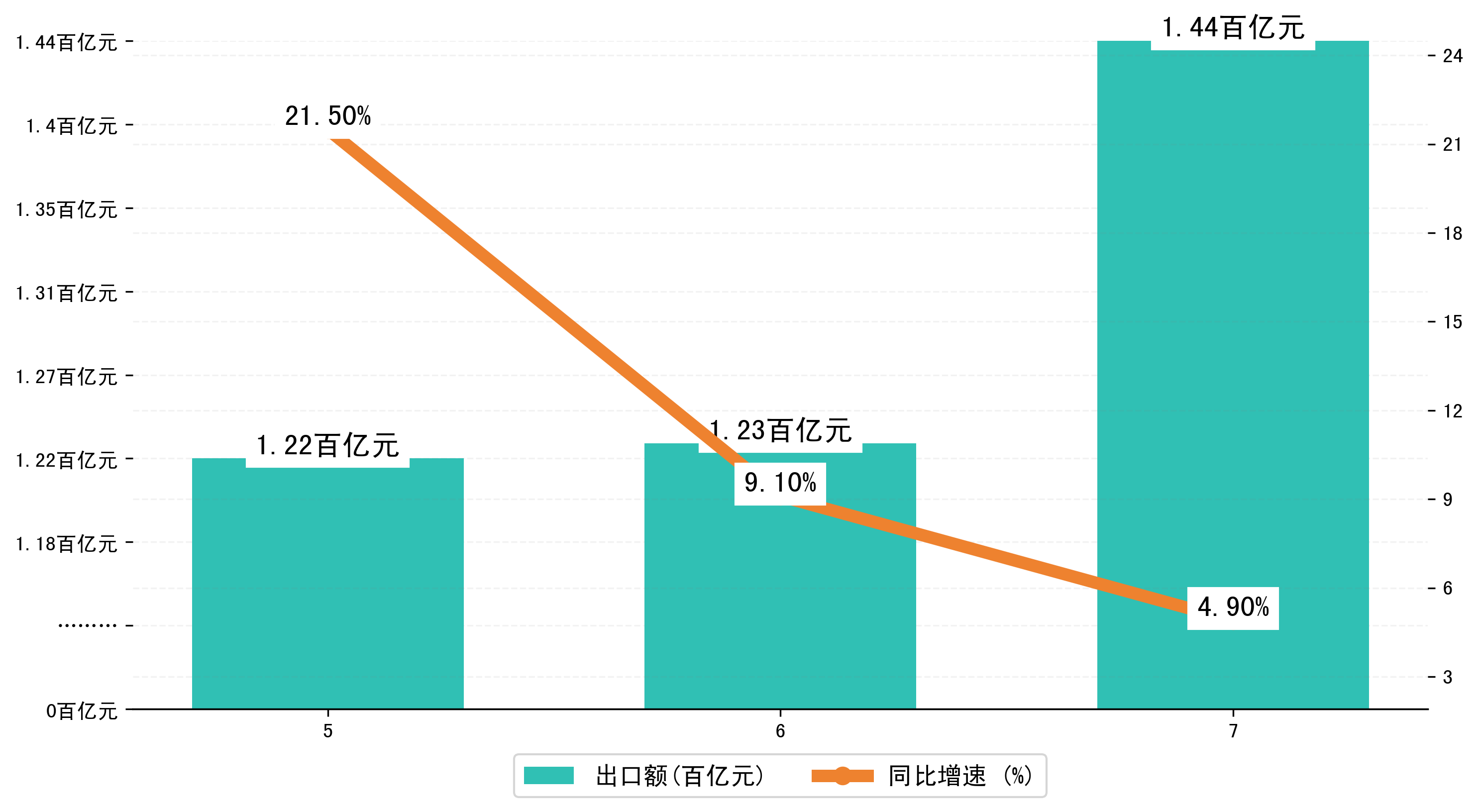 以人民币计,2023年1-7月湖州市出口额为882,9888.4903万元,相比上年同期增加了33,4388.5782万元,同比增加了4.90%。