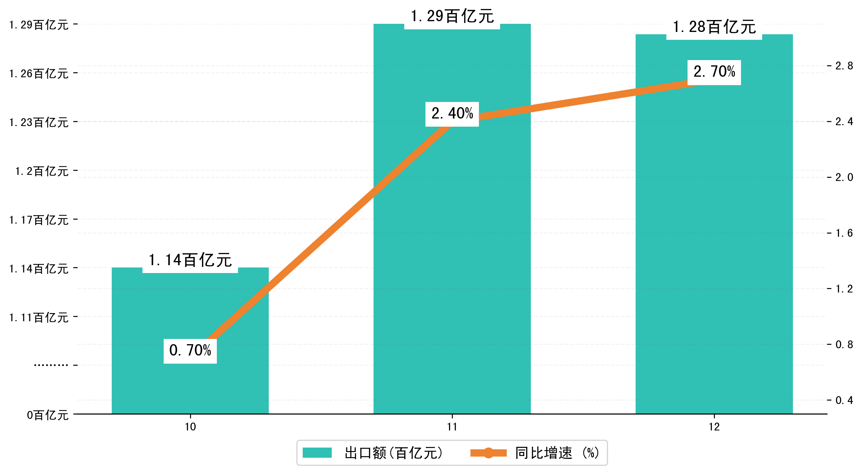 以人民币计,2024年12月湖州市出口额为127,9404.0824万元,相比上月减少了6154.1923万元;相比上年同期增加了7,5621.3521万元,同比增加了2.70%。