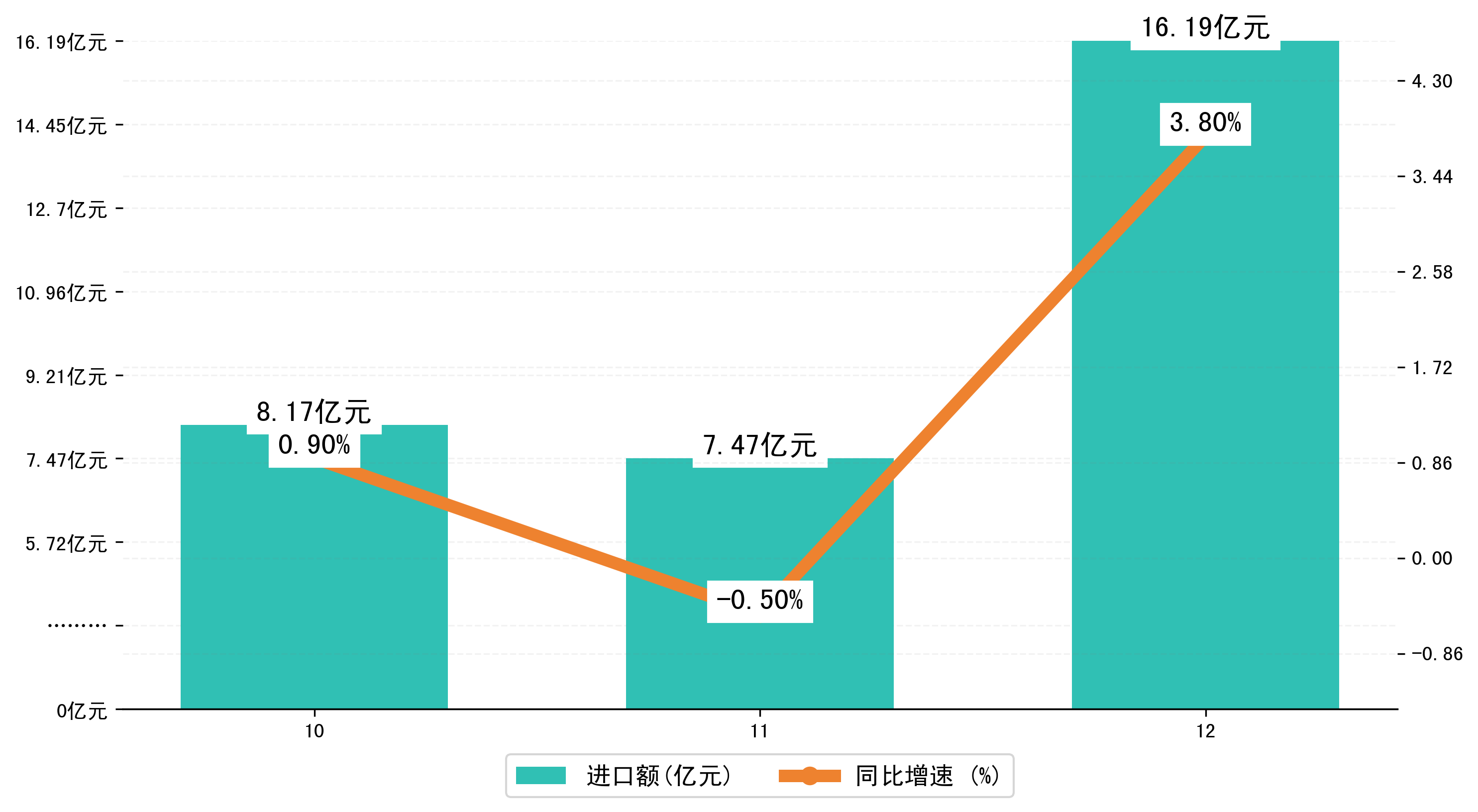 以人民币计,2024年12月湖州市进口额为16,1930.1404万元,相比上月增加了8,7246.359万元;相比上年同期增加了5,4813.1712万元,同比增加了3.80%。