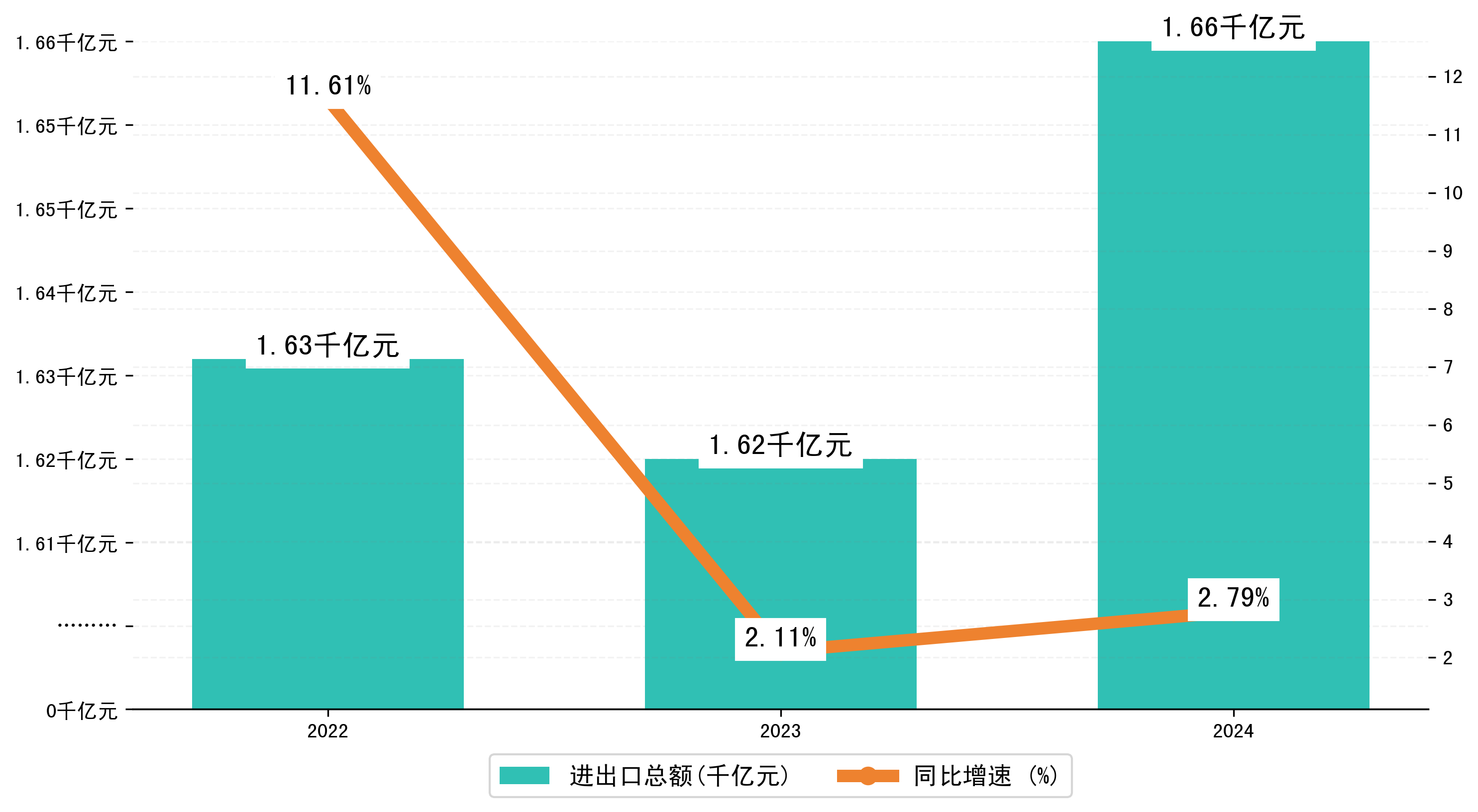 以人民币计,2024年1-12月湖州市进出口总额为1664,0128.2857万元,相比上年同期增加了45,2262.49万元,同比增加了2.80%。