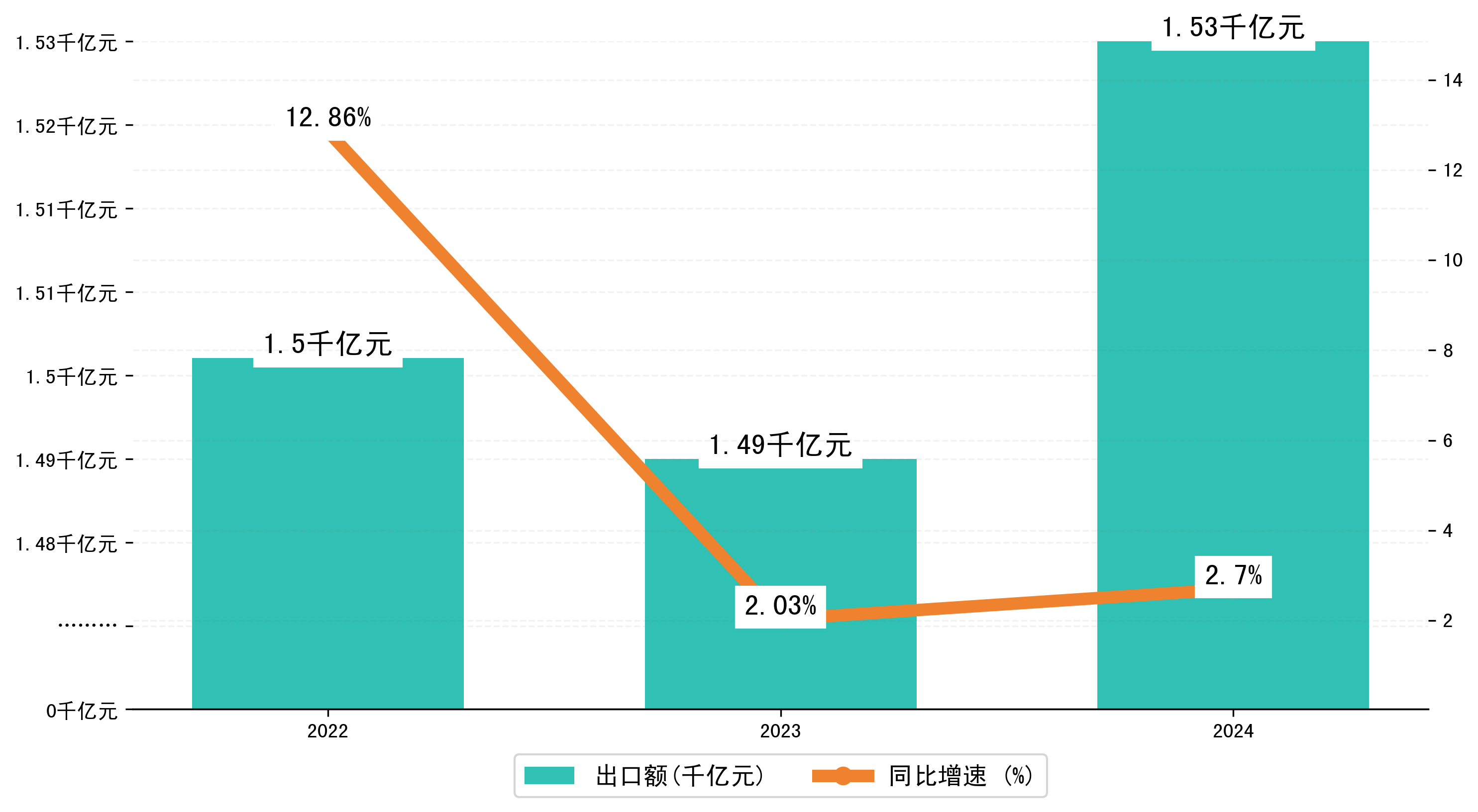 以人民币计,2024年1-12月湖州市出口额为1530,6206.1968万元,相比上年同期增加了40,1880.6815万元,同比增加了2.70%。