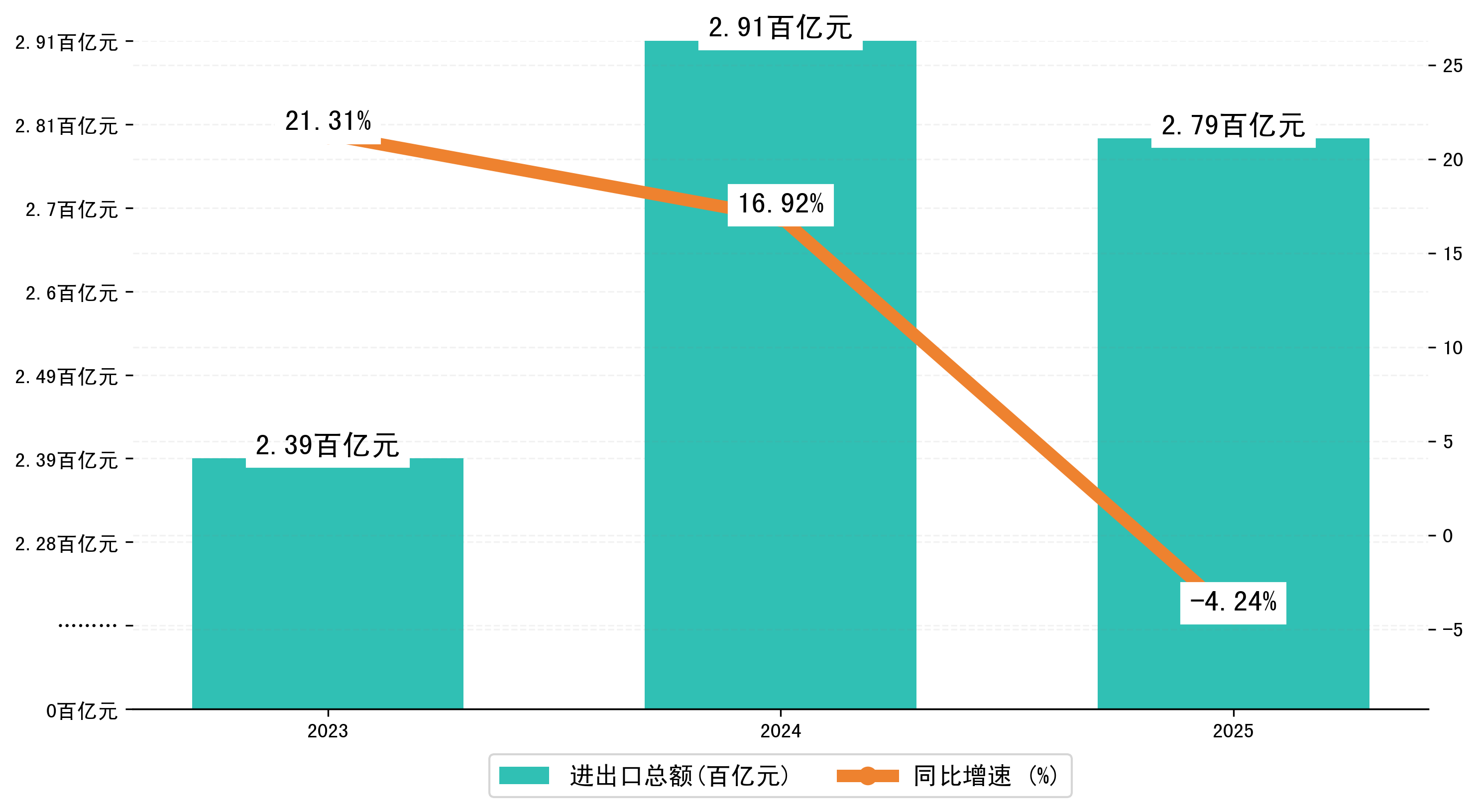 以人民币计,2025年1-2月湖州市进出口总额为278,9634.8634万元,相比上年同期减少了12,3572.3784万元,同比减少了-1.70%。
