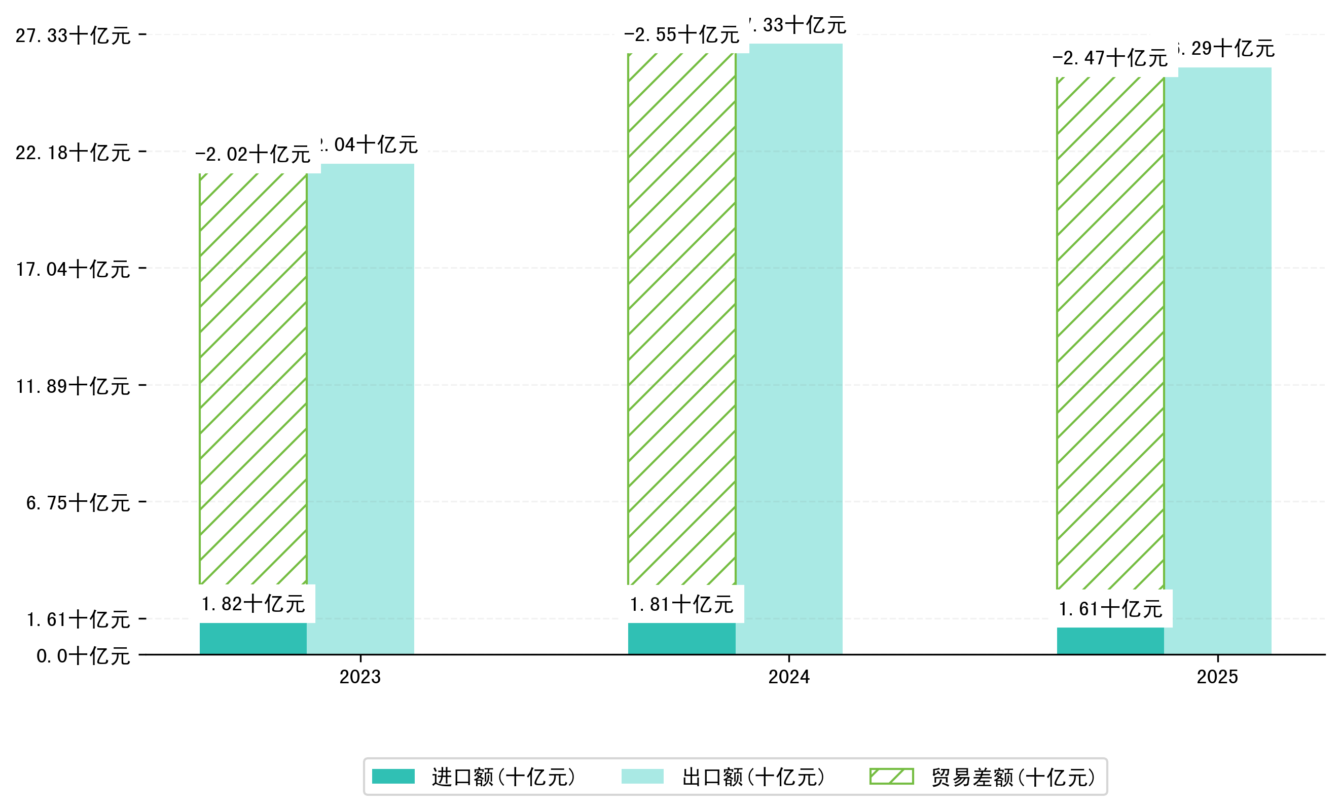 以人民币计,2025年1-2月湖州市贸易差额为246,8398,8096万元(贸易顺差),相比上年同期减少了8,3629,6459万元,同比减少-3.28%。