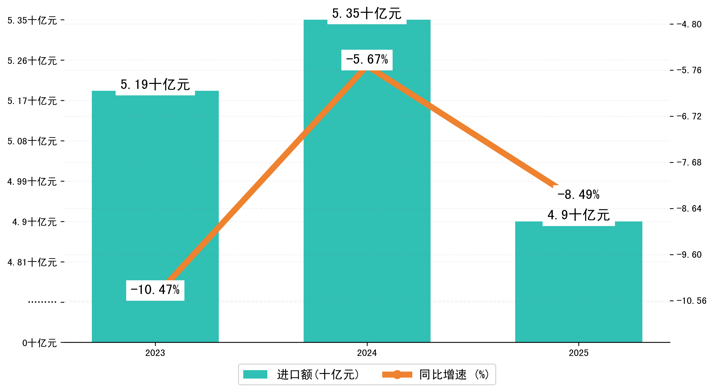以美元计,2025年1-5月湖州市进口额为6,8192.8344万美元,相比上年同期减少了7167.5764万美元,同比减少-7.00%。