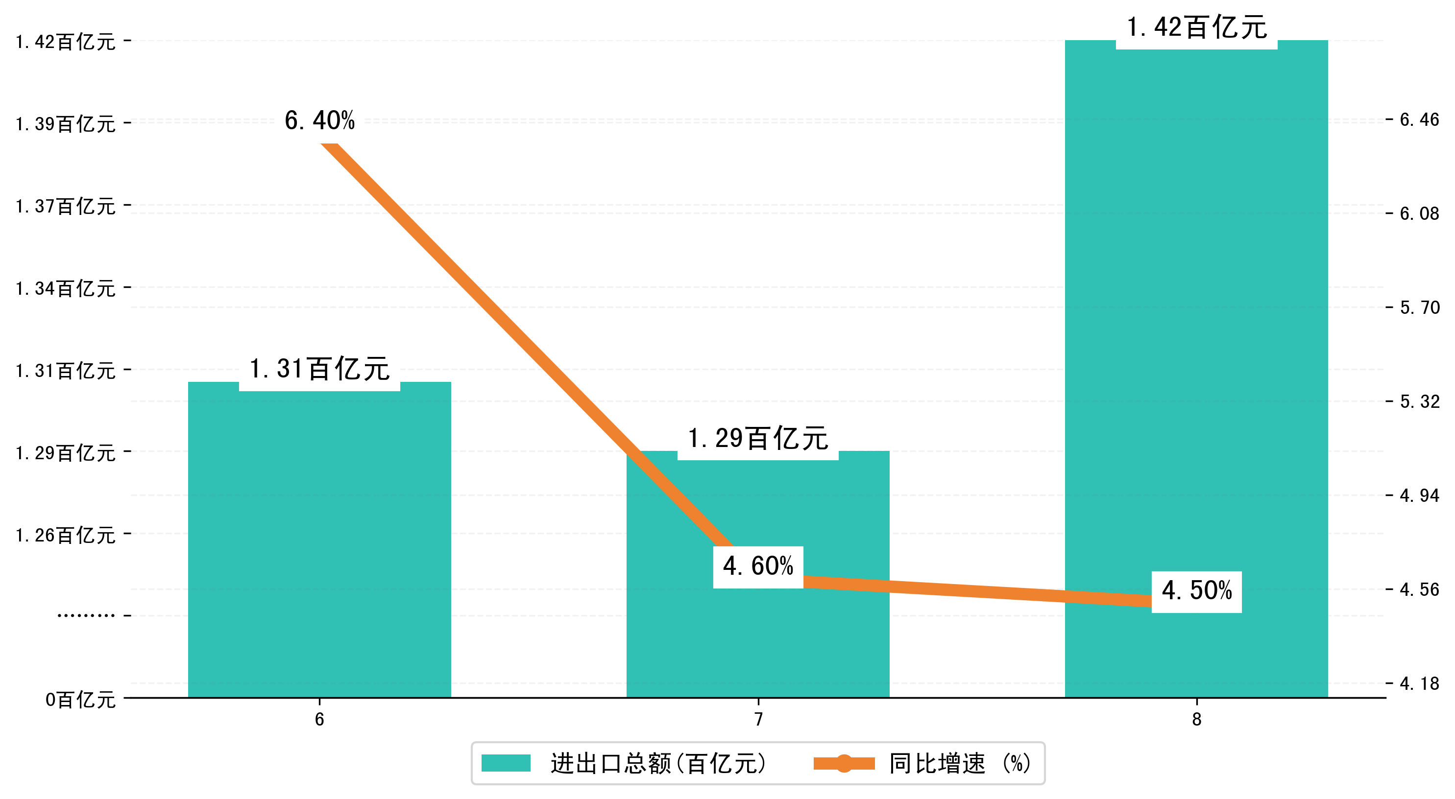 以人民币计,2025年8月湖州市进出口总额为141,8911.618万元,相比上月增加了13,0031.7262万元;相比上年同期增加了4,9015.9881万元,同比增加了4.50%。