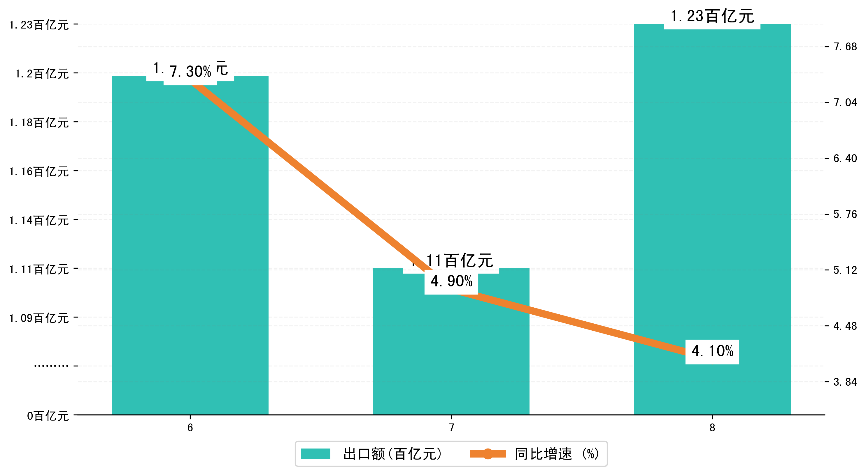 以人民币计,2025年1-8月湖州市出口额为1095,4886.7211万元,相比上年同期增加了43,3285.6621万元,同比增加了4.10%。