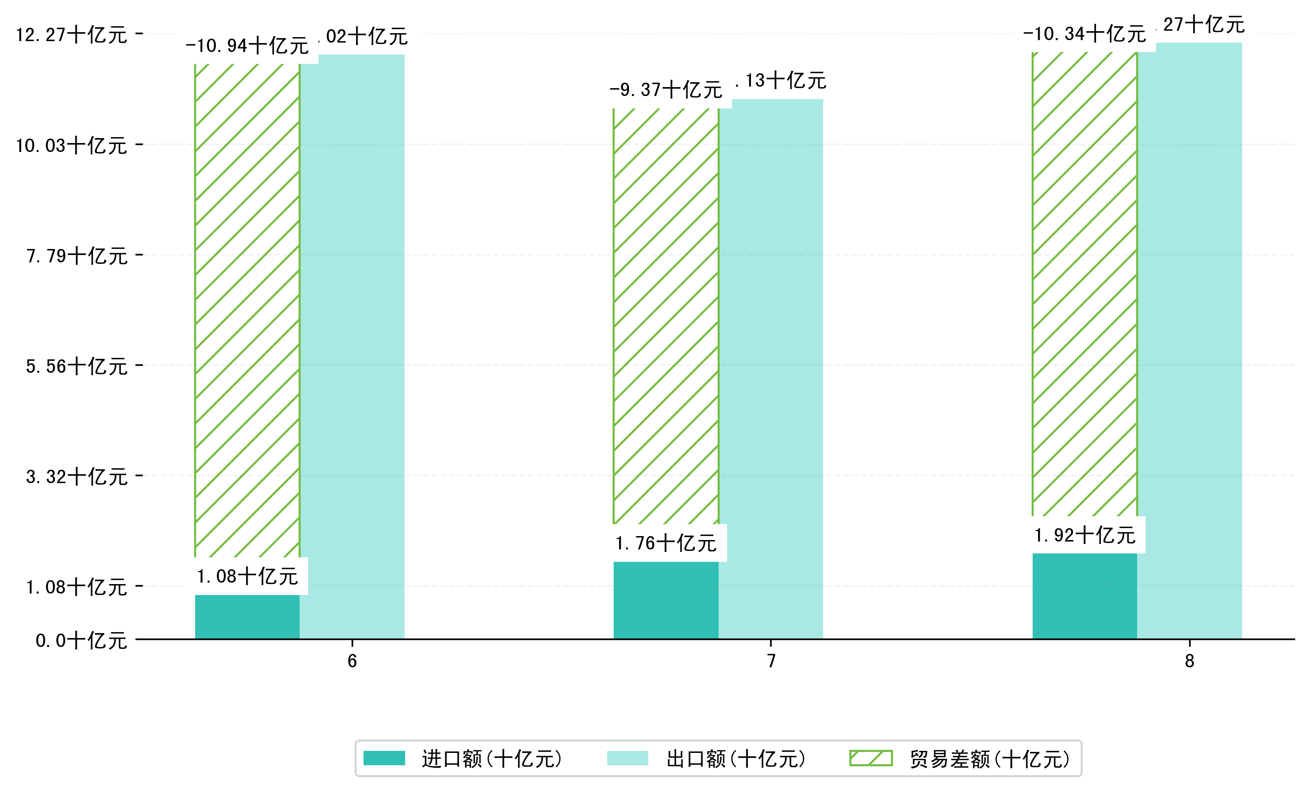 以人民币计,2025年8月湖州市贸易差额为103,4234,0612万元(贸易顺差),相比上月增加了9,7350,7962万元,即1,3928,6354万美元;相比上年同期减少了9,6560,2507万元,同比减少-8.54%。