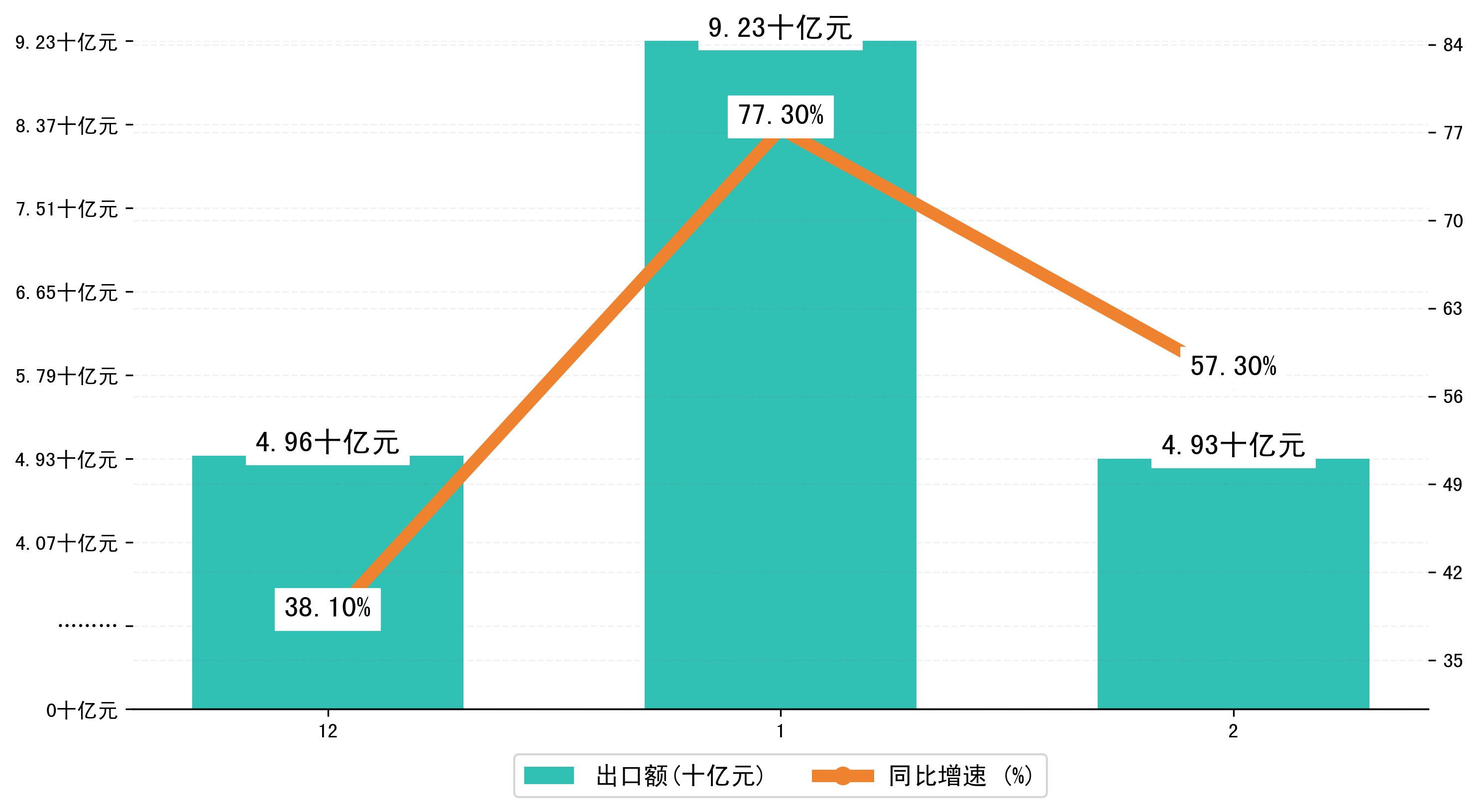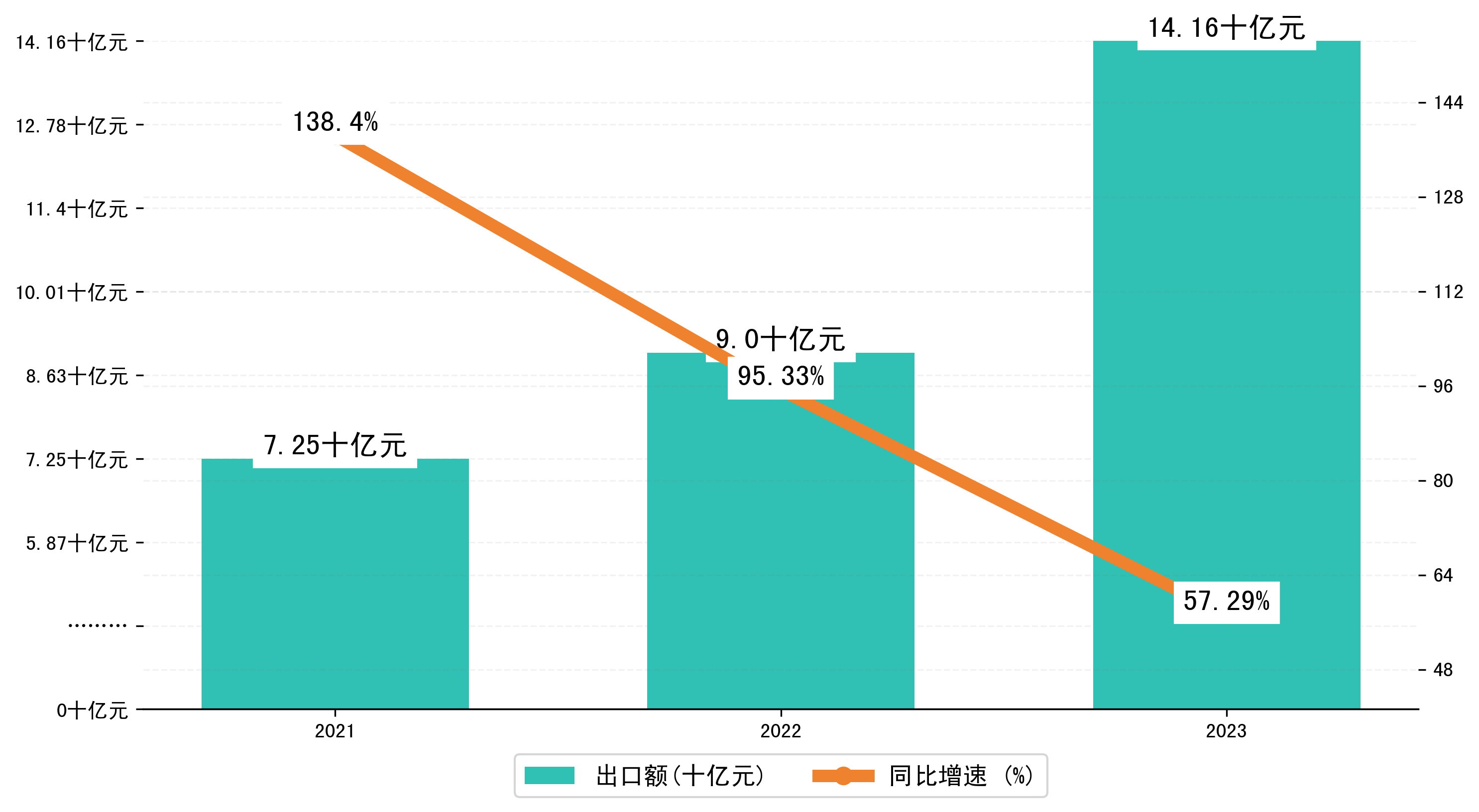 以人民币计,2023年1-2月吉安市出口额为141,6128.8623万元,相比上年同期增加了51,5815.7255万元,同比增加了57.30%。